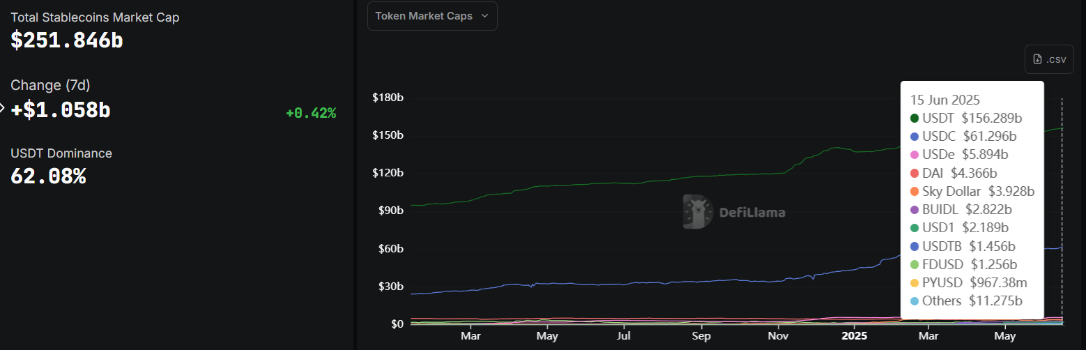 Tether स्टेबलकॉइन मार्केट पर भी हावी है, इसके कुल मूल्य का 62% नियंत्रित करता है। $156 बिलियन के मार्केट कैप के साथ, Tether $251.8 बिलियन के स्टेबलकॉइन मार्केट का सबसे बड़ा हिस्सा बनाता है। अपने महत्वपूर्ण मार्केट उपस्थिति के बावजूद, Tether ने सीधे राजनीतिक भागीदारी के बारे में सतर्कता बरती है।