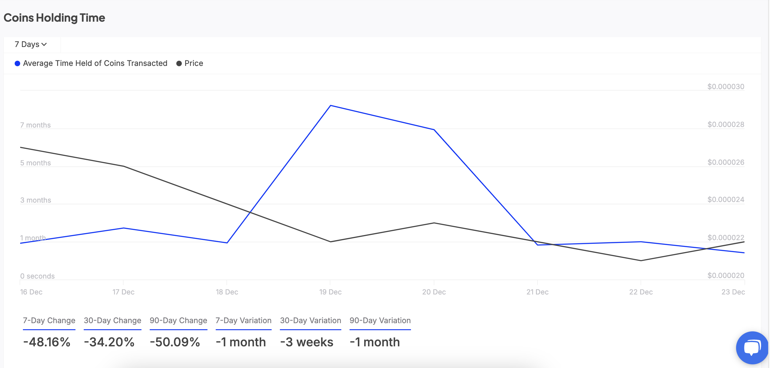 किसी एसेट का होल्डिंग समय मापता है कि उसके टोकन्स को बेचे या ट्रांसफर किए जाने से पहले औसतन कितने समय तक वॉलेट्स में रखा जाता है। जब यह मेट्रिक गिरता है, तो यह मार्केट प्रतिभागियों के बीच बढ़ते सेलिंग प्रेशर को इंगित करता है। यह स्थिति एसेट के प्रति मंदी की भावना को दर्शाती है और इसकी कीमत में गिरावट में योगदान करती है।