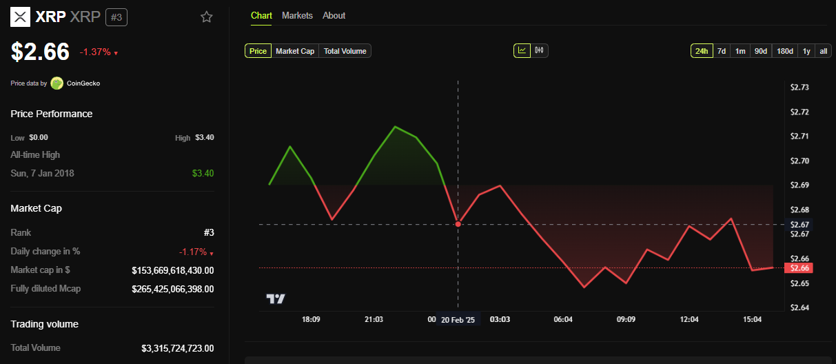 कोई भी समाधान, चाहे वह खारिज हो या समझौता, संपत्ति के भविष्य के लिए महत्वपूर्ण प्रभाव डाल सकता है। इस लेखन के समय, XRP $2.66 पर ट्रेड कर रहा था, जो शुक्रवार के सत्र के खुलने के बाद से लगभग 2% नीचे था।