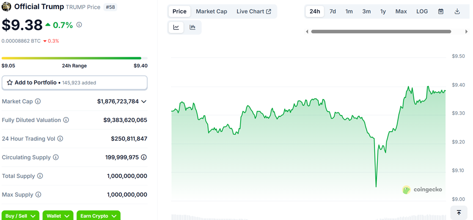 TRUMP मीम कॉइन पिछले वर्ष में प्रमुख बन गया है, अटकलों, सेलिब्रिटी समर्थन और US राष्ट्रपति से जुड़ाव के कारण। इन विकासों के बीच, टोकन पिछले 24 घंटों में मामूली 0.7% ऊपर है।