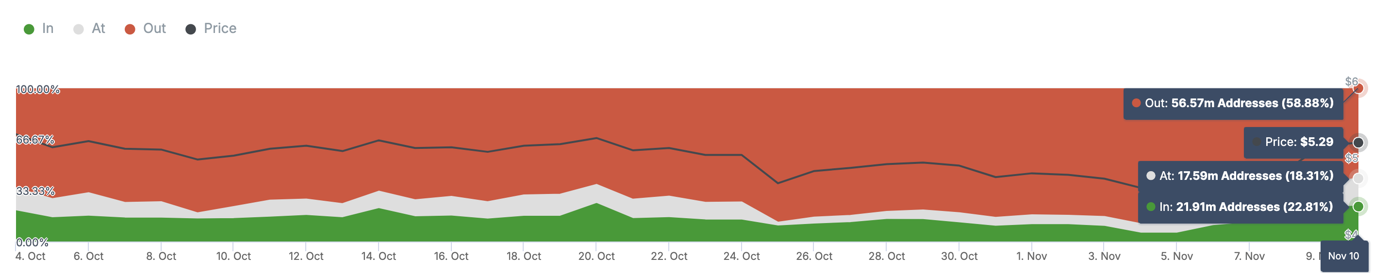 यह मूल्य कुल धारक संख्या का 22.81% दर्शाता है। 17.59 मिलियन पते, जो धारकों का 18.31% हैं, ब्रेकइवन पॉइंट पर हैं, जबकि 58.88% फिलहाल पैसे से बाहर हैं। इस डेटा का विश्लेषण करके, HIOM उन Toncoin वॉलेट पतों का प्रतिशत प्रकट करता है जिन्होंने लाभ कमाया होगा या हानि उठाई होगी अगर वे किसी विशेष समय पर अपनी होल्डिंग्स बेच देते।