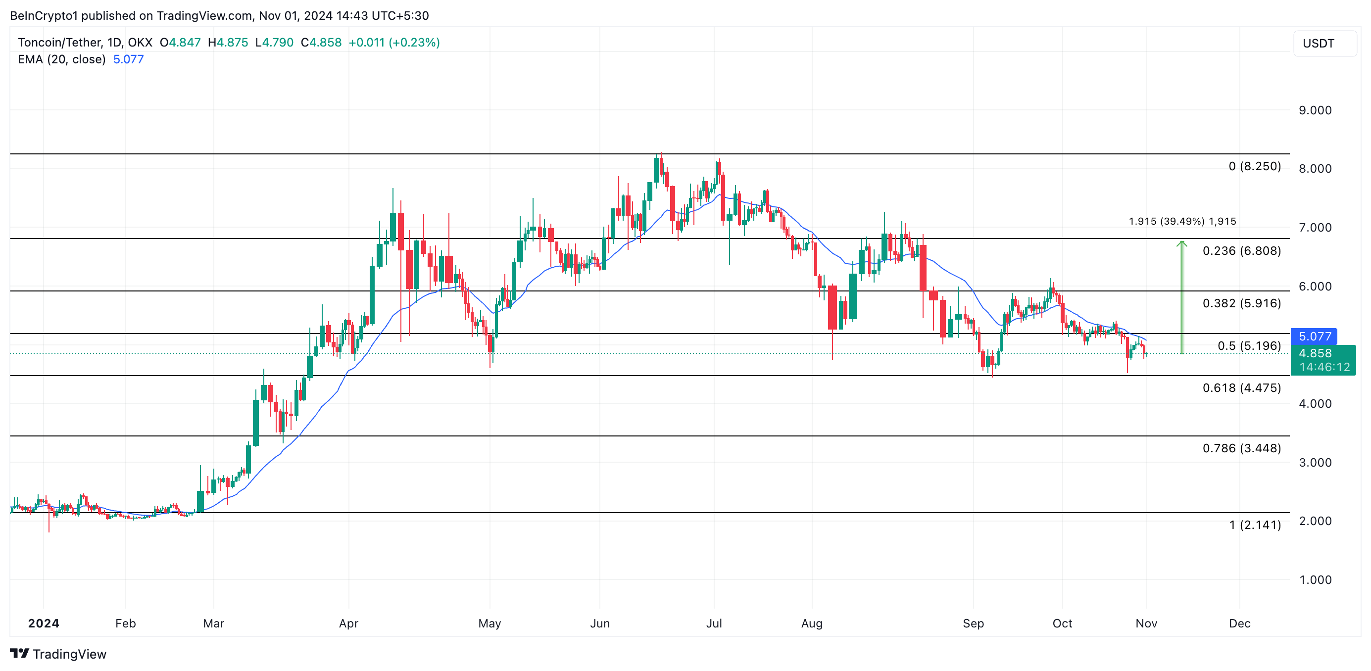 हालांकि, यदि बाजार की भावना बेयरिश से बुलिश में बदल जाती है और Toncoin की मांग बढ़ती है, तो यह टोकन $5.19 के प्रतिरोध को पार करने का प्रयास कर सकता है। एक सफल ब्रेकआउट इसे $6.80 की ओर ले जा सकता है, जो इसकी वर्तमान कीमत से 39% की संभावित वृद्धि को चिह्नित करेगा।