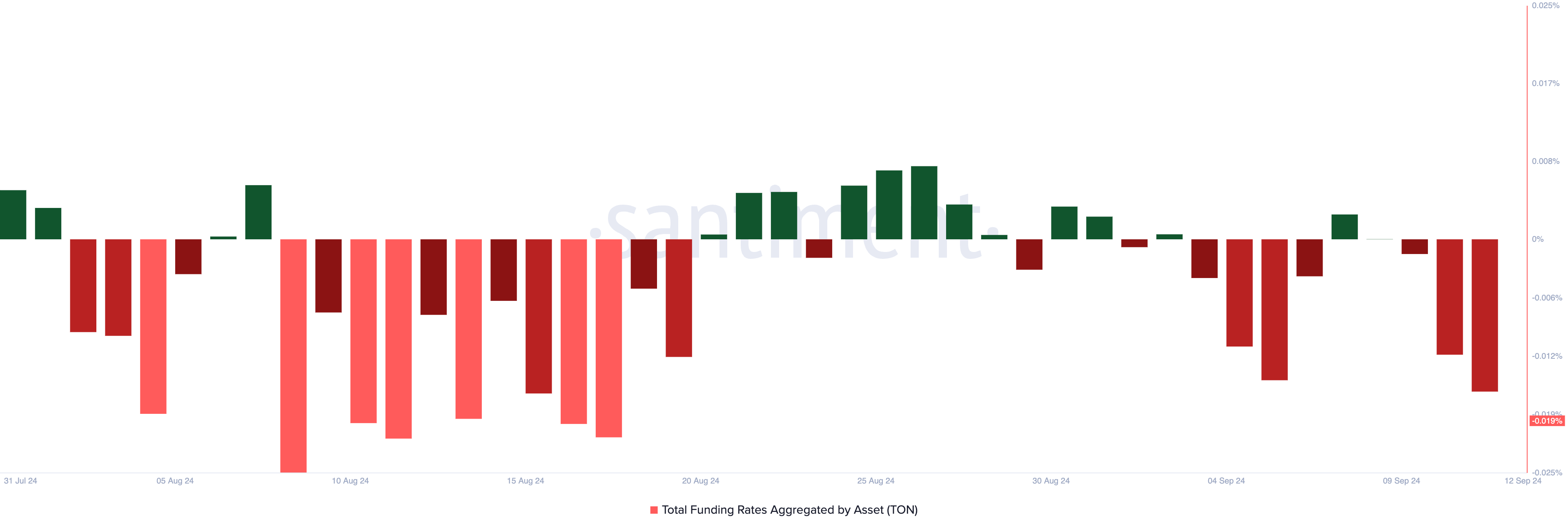 जबकि ऑन-चेन मेट्रिक्स Toncoin के लिए एक संभावित खरीदारी का अवसर सुझाते हैं, टोकन आगे की गिरावट के लिए संवेदनशील बना हुआ है क्योंकि एक प्रबल बियरिश बायस मौजूद है। यह भावना Toncoin की वर्तमान फंडिंग दर -0.019% से प्रतिबिंबित होती है, जो इंगित करती है कि बाजार की भावना शॉर्ट पोजीशन की ओर झुकी हुई है।