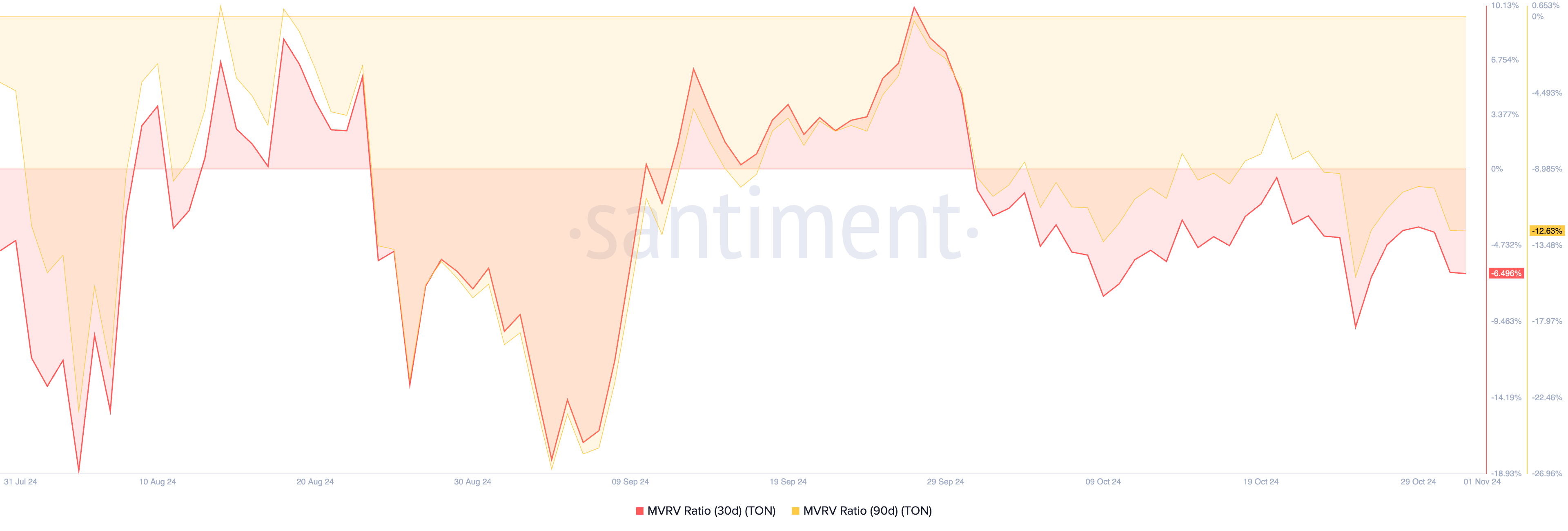 Toncoin का Market Value to Realized Value (MVRV) अनुपात, जो इसके होल्डर्स की समग्र लाभप्रदता को मापता है, सुझाव देता है कि यह ऑल्टकॉइन हाल के हफ्तों में अंडरवैल्यूड रहा है। वर्तमान में, इसके 30-दिन और 90-दिन के MVRV अनुपात क्रमशः -6.49% और -12.63% हैं।