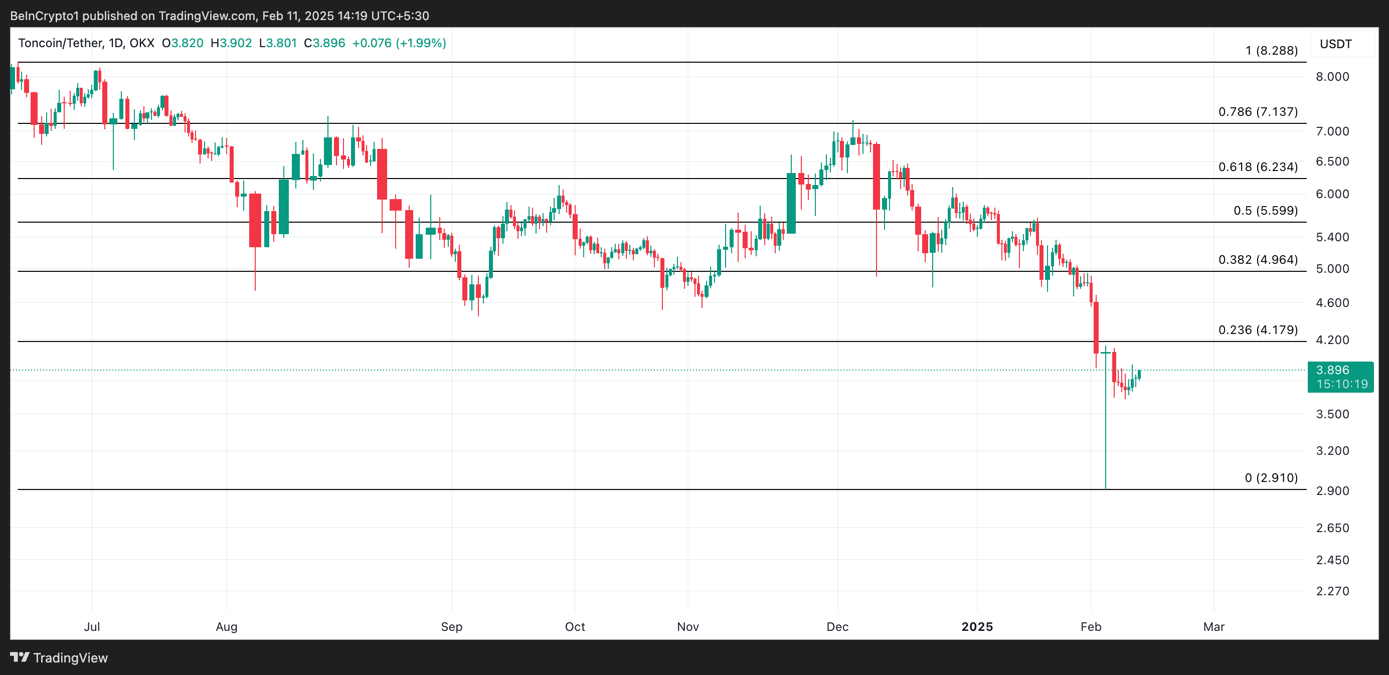 Telegram से जुड़ा Toncoin पिछले महीने में एक महत्वपूर्ण मूल्य गिरावट का सामना कर रहा है। यह वर्तमान में $3.89 पर ट्रेड कर रहा है, पिछले 30 दिनों में अपनी 28% मूल्य खो चुका है।