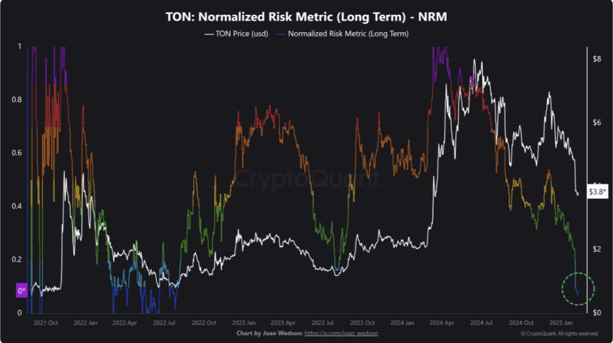 एक नए रिपोर्ट में, CryptoQuant के विश्लेषक Joao Wedson ने नोट किया कि TON ने Normalized Risk Metric (NRM) इंडिकेटर पर ऐतिहासिक रूप से निम्न स्तर प्राप्त कर लिया है, जो लॉन्ग-टर्म निवेशकों के लिए खरीदारी का अवसर प्रस्तुत करता है।