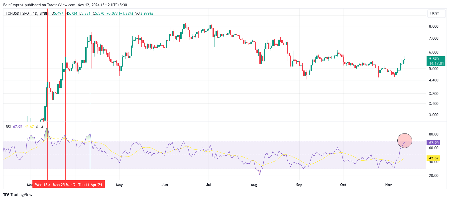 Toncoin की मैक्रो गति में भी संभावित उलटफेर के संकेत दिख रहे हैं, जैसा कि Relative Strength Index (RSI) में दिख रहा है, जो ओवरबॉट जोन के करीब पहुँच रहा है। ऐतिहासिक रूप से, जब Toncoin का RSI इस जोन को पार करता है, तो कीमत में सुधार या उलटफेर का अनुभव होता है। यदि RSI ओवरबॉट क्षेत्र में प्रवेश करता है, तो Toncoin समान दबाव का सामना कर सकता है, जिससे पुलबैक हो सकता है जो हाल की रैली को ठंडा कर सकता है।
