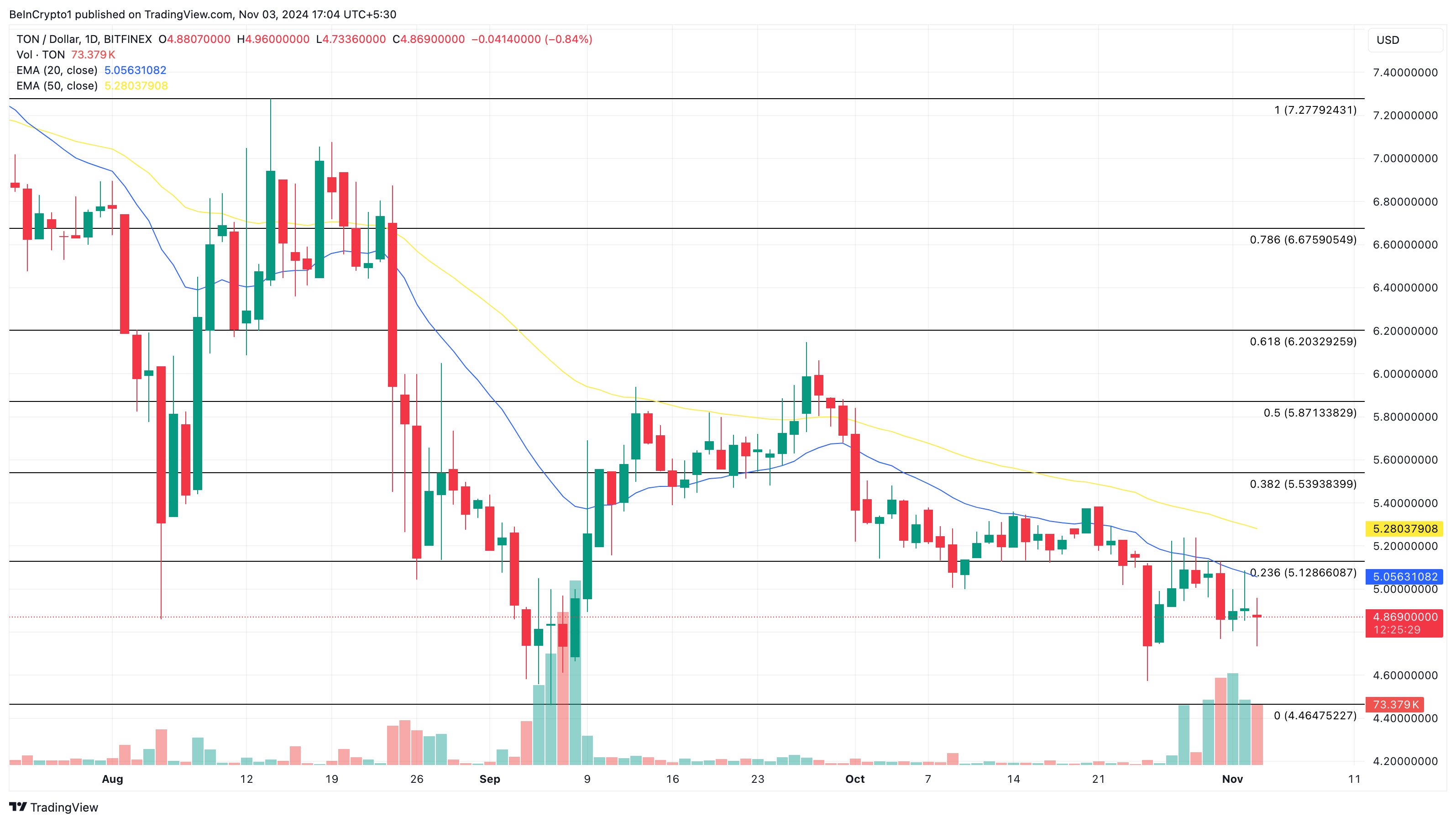 Toncoin की कीमत इस लेखन के समय $4.87 है। दैनिक चार्ट के अनुसार, खरीदारी की मात्रा की कमी के कारण यह altcoin सीमा से नीचे गिर गया है। इसके बाद, TON महत्वपूर्ण Exponential Moving Averages (EMAs) से नीचे गिर गया है।