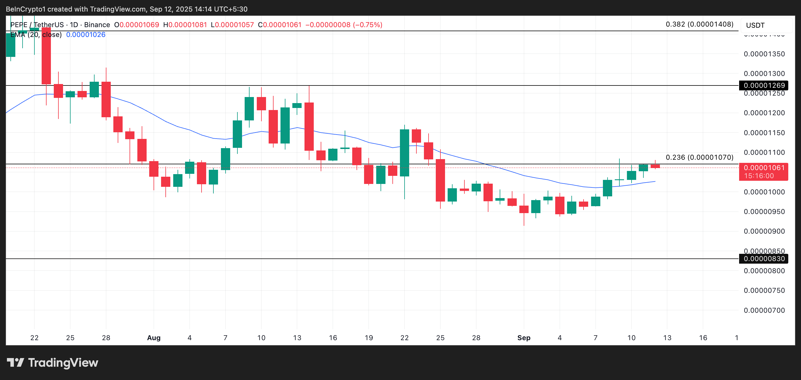 यदि खरीदारी का दबाव ऊंचा रहता है, तो PEPE रेजिस्टेंस को पार कर सकता है $0.00001070 पर और संभावित रूप से अगले प्रमुख स्तर $0.00001269 की ओर बढ़ सकता है।