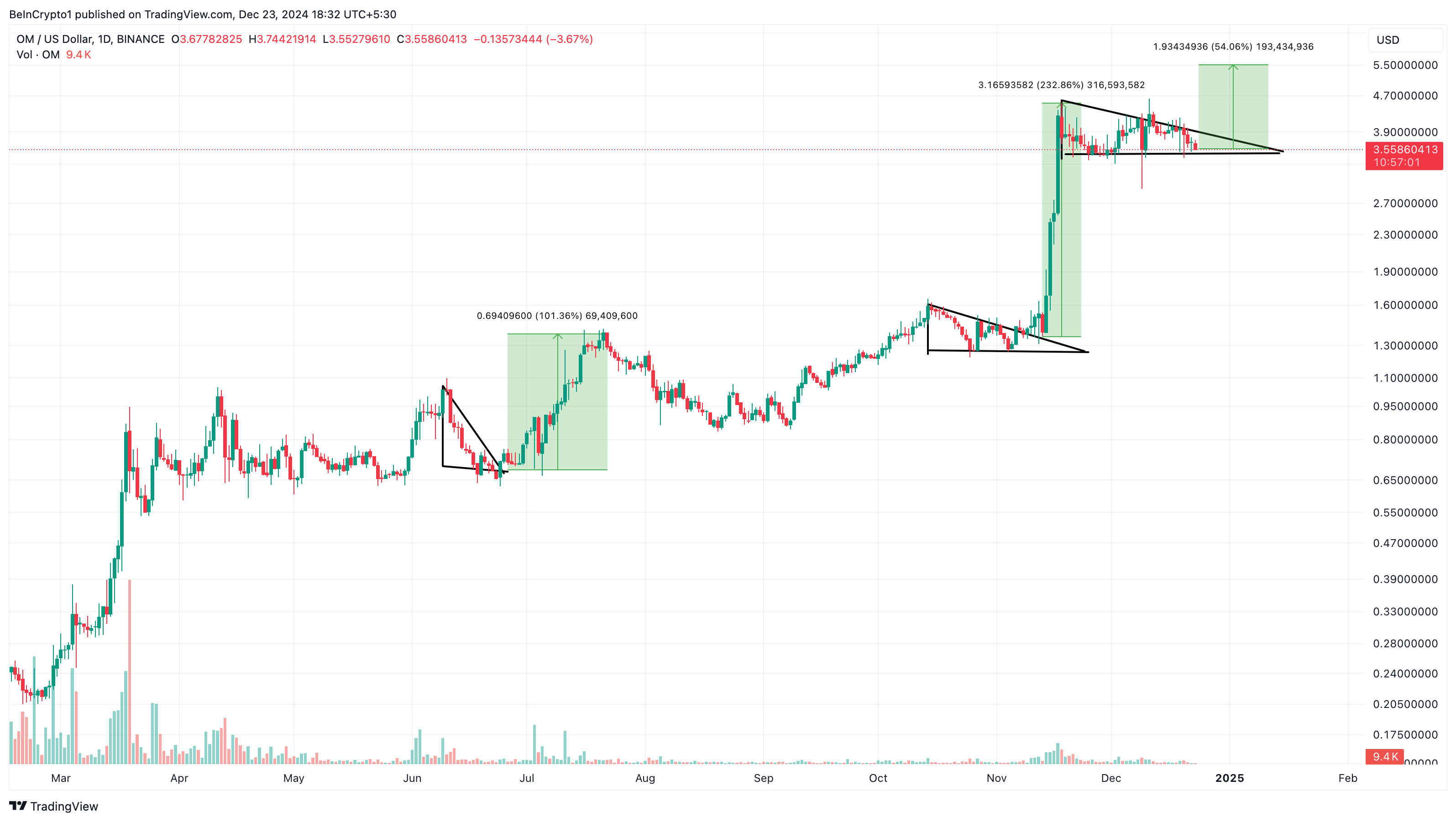 हालांकि, यह 11 दिसंबर को $4.60 के ऑल-टाइम हाई तक पहुंच गया। वर्तमान में, OM उस शिखर से 22.25% नीचे है और $3.58 पर ट्रेड कर रहा है। दैनिक चार्ट पर, OM लगभग हर बार एक डिसेंडिंग ट्रायंगल से बाहर निकलने पर एक नया ऑल-टाइम हाई हिट करता है।