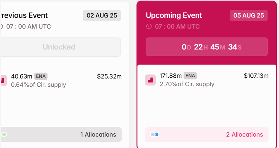मंगलवार को, 171.88 मिलियन ENA टोकन अनलॉक किए जाएंगे, जो टोकन की सर्क्युलेटिंग सप्लाई का 2.7% है। Tokenomist.ai के डेटा के अनुसार, ये टोकन कोर कंट्रीब्यूटर्स और निवेशकों को आवंटित किए जाएंगे, जिससे ENA की कीमत सप्लाई शॉक के कगार पर है।
