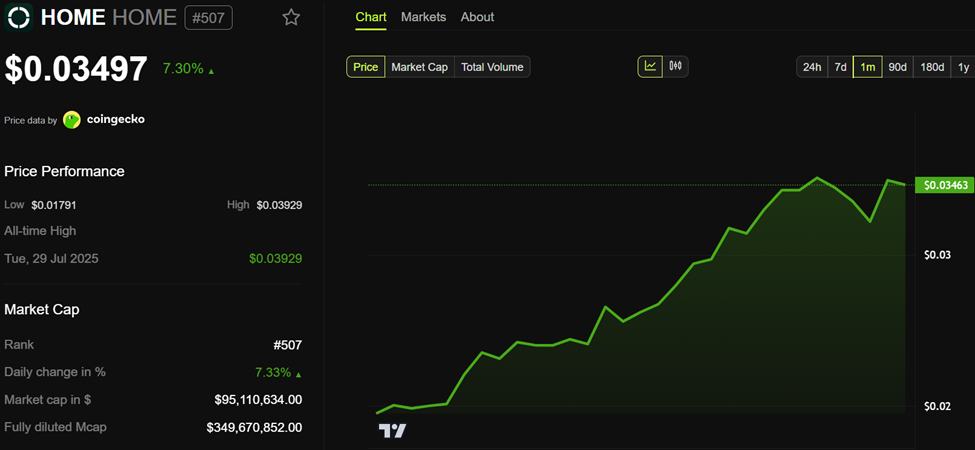 इस लेखन के समय, HOME $0.0349 पर ट्रेड कर रहा था, पिछले 24 घंटों में 7% से अधिक बढ़ा। यह उछाल इस उम्मीद के बीच आता है कि बायबैक HOME की सर्क्युलेटिंग सप्लाई को कम करेगा, जिससे डिमांड बढ़ेगी।