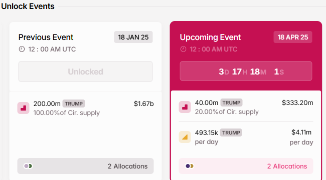 इस सूची में जोड़ते हुए, $332 मिलियन मूल्य के TRUMP टोकन्स इस सप्ताह अनलॉक होंगे, जिससे बाजार में महत्वपूर्ण लिक्विडिटी आएगी। विशेष रूप से, शुक्रवार, 18 अप्रैल को, नेटवर्क 40 मिलियन TRUMP टोकन्स अनलॉक करेगा, जो इसकी सर्क्युलेटिंग सप्लाई का 20% है।