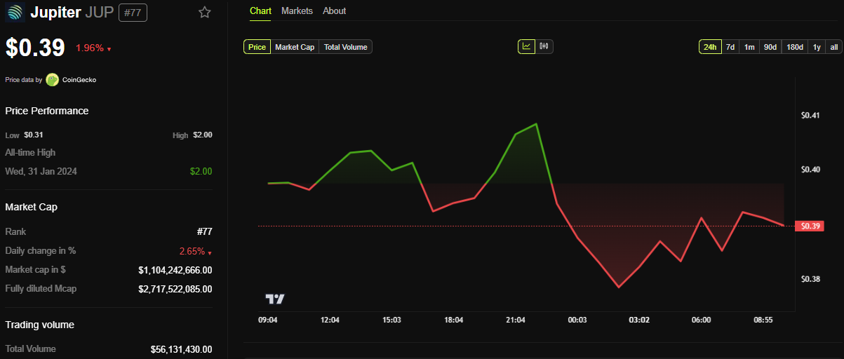 इस विकास से पहले, Jupiter का JUP टोकन $0.39 पर ट्रेड कर रहा था, जो पिछले 24 घंटों में लगभग 2% नीचे था।