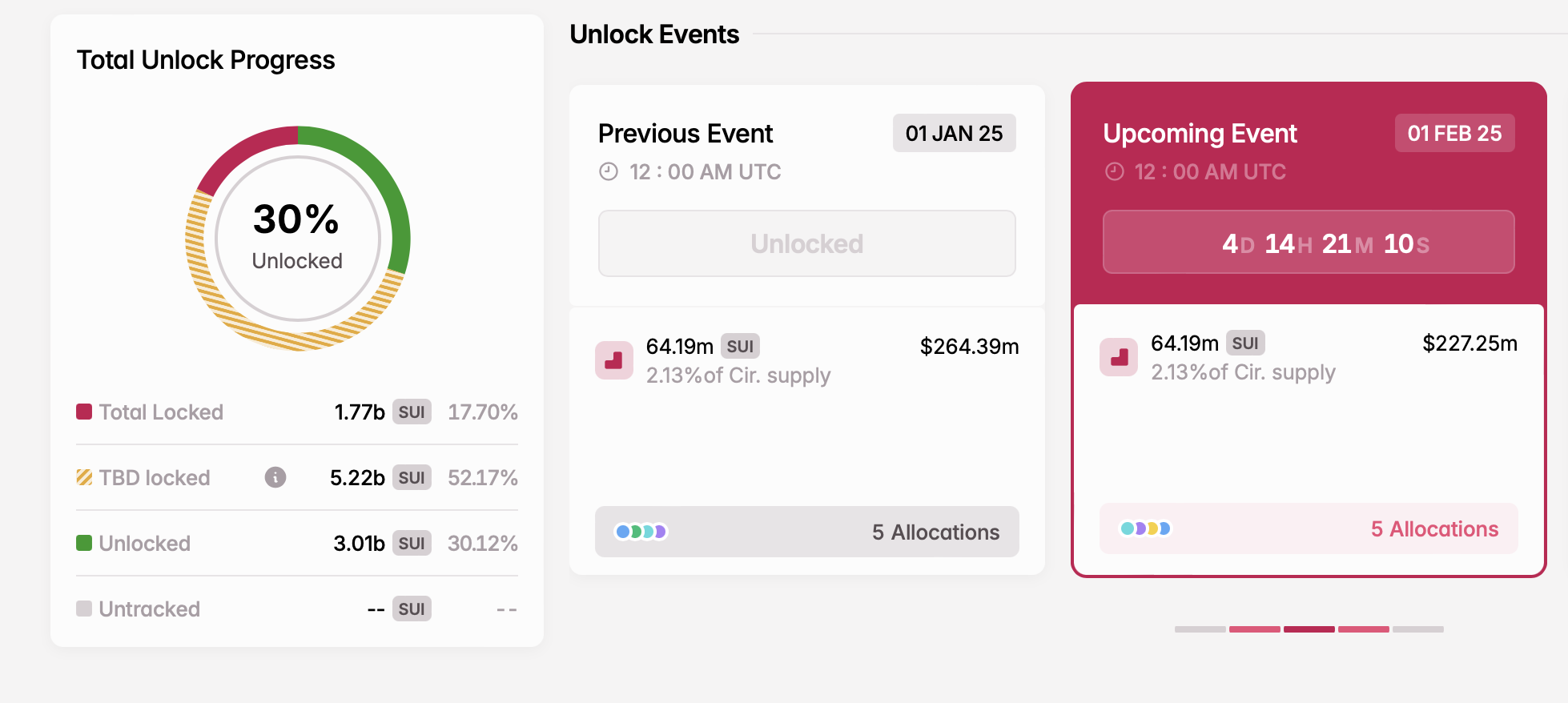 BeInCrypto ने भी इस हफ्ते देखने लायक पांच टोकन अनलॉक्स पर रिपोर्ट किया। इनमें से एक Sui है, जो 1 फरवरी को मार्केट में 64.19 मिलियन SUI टोकन जारी करने की उम्मीद है।