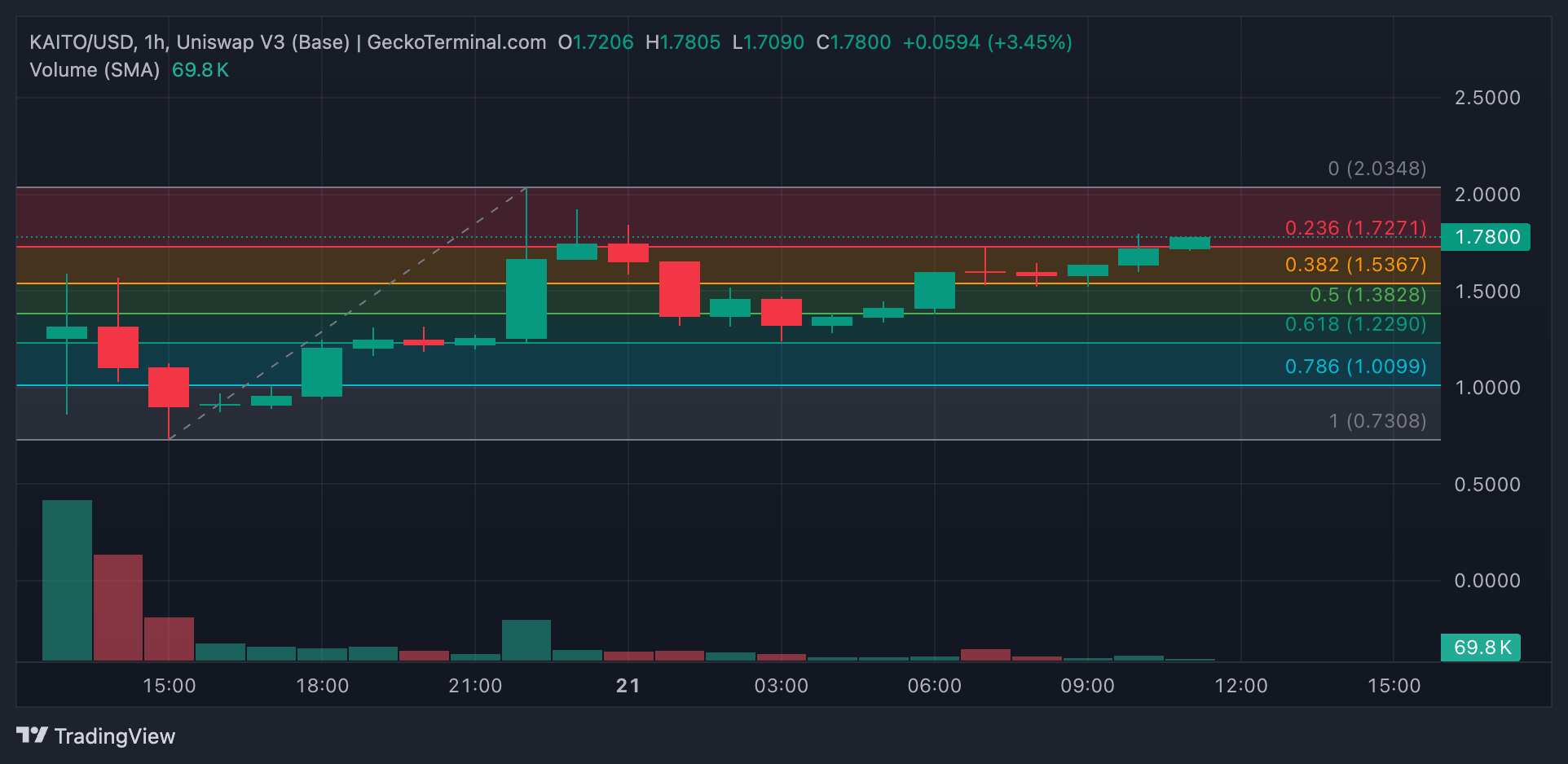 नया एयरड्रॉप किया गया टोकन KAITO आज एक ट्रेंडिंग altcoin है। यह वर्तमान में $1.78 पर ट्रेड कर रहा है, पिछले 24 घंटों में 42% की वृद्धि के साथ।