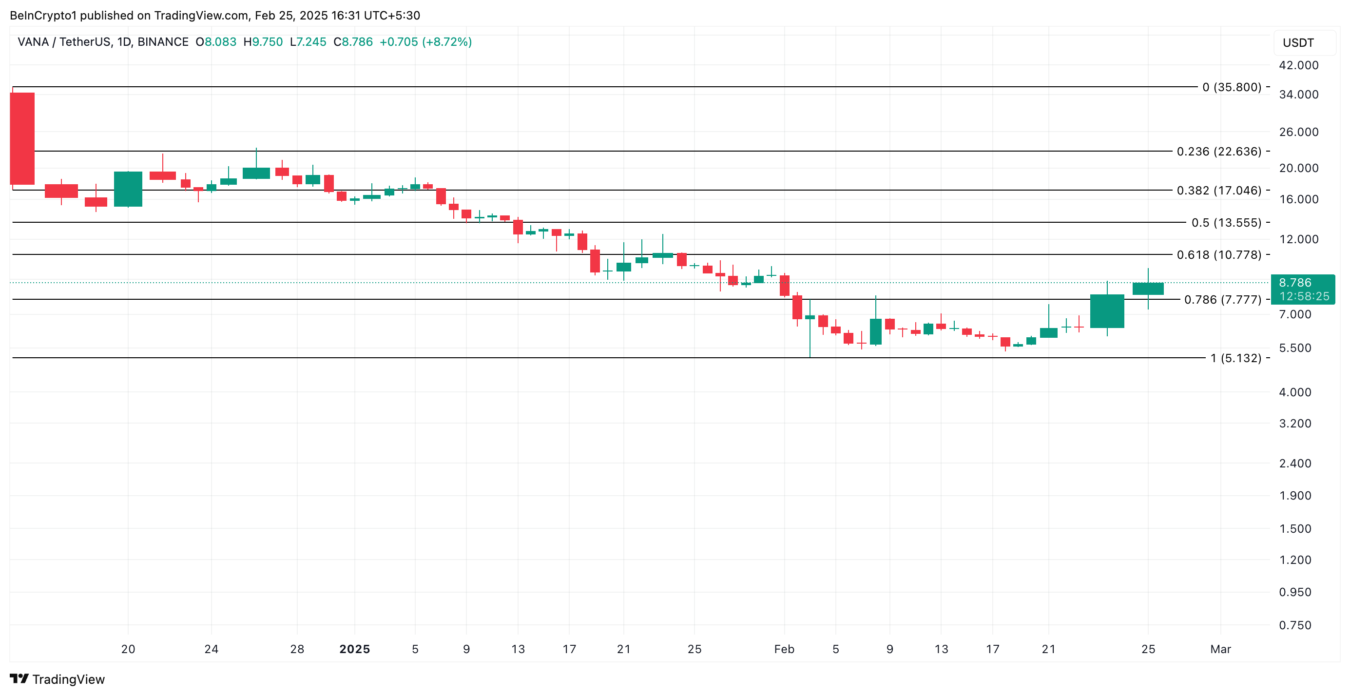 प्रेस समय में, VANA $8.78 पर ट्रेड कर रहा है। पिछले 24 घंटों में, इसका ट्रेडिंग वॉल्यूम $639 मिलियन तक पहुंच गया है, जो उस अवधि के दौरान 2,800% से अधिक बढ़ गया है। VANA के ट्रेडिंग वॉल्यूम में यह महत्वपूर्ण वृद्धि दर्शाती है कि इसकी वर्तमान रैली altcoin की मांग से प्रेरित है।