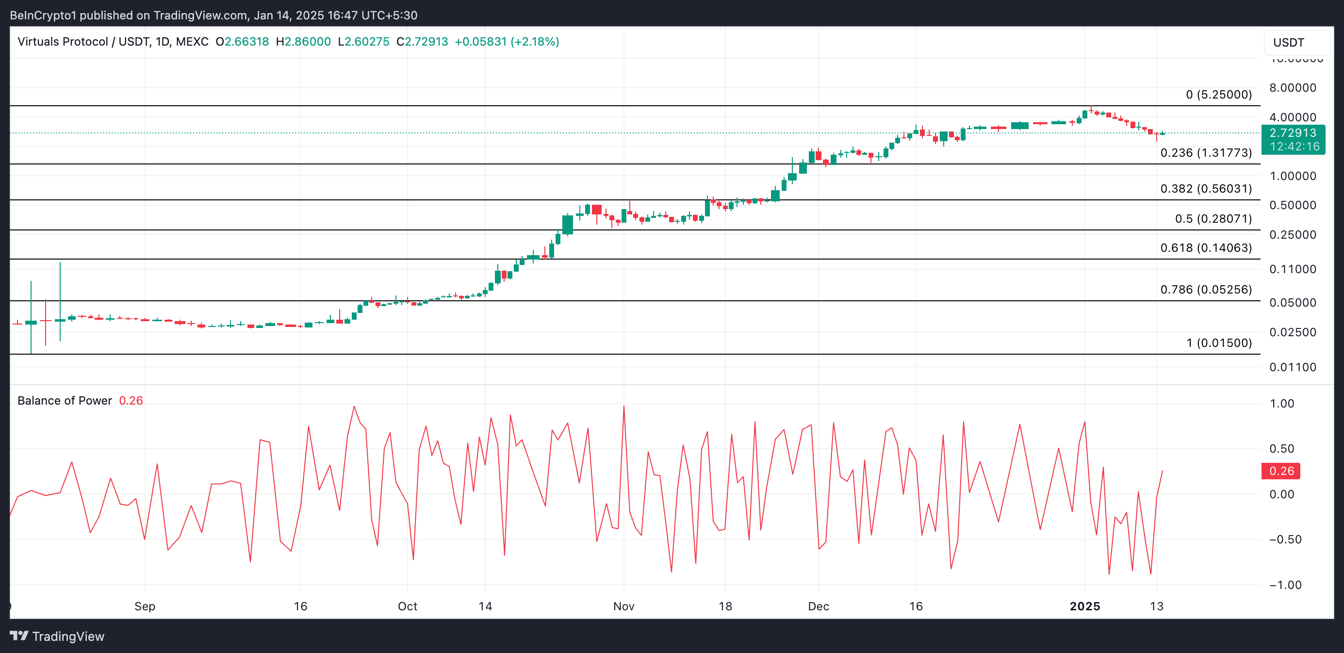 अगर यह जारी रहता है, तो VIRTUAL की कीमत $5.25 के अपने ऑल-टाइम हाई तक बढ़ सकती है, जिस पर यह आखिरी बार 2 जनवरी को ट्रेड हुआ था। इसके विपरीत, टोकन के एक्यूम्यूलेशन में गिरावट VIRTUAL की कीमत को $1.31 तक गिरा सकती है।