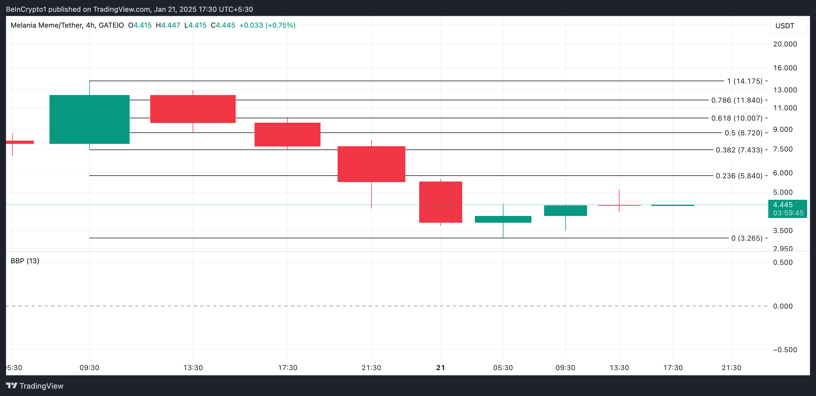 MELANIA सोमवार के ट्रेडिंग सत्र के दौरान $14.17 के ऑल-टाइम हाई पर पहुंचा और तब से 71% गिर गया है। इस लेखन के समय, मीम कॉइन $4.45 पर ट्रेड कर रहा है।