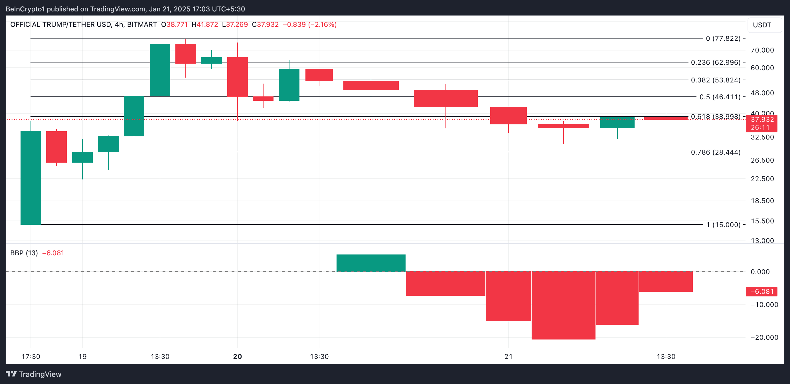 यह 19 जनवरी को $77.82 के ऑल-टाइम हाई पर पहुंचा, और तब से इसकी कीमत 50% से अधिक गिर गई है बढ़ते सेल-ऑफ़ के कारण। TRUMP के नकारात्मक Elder-Ray Index ने इसकी मांग में गिरावट की पुष्टि की है। प्रेस समय पर, इंडिकेटर -6.63 पर है।