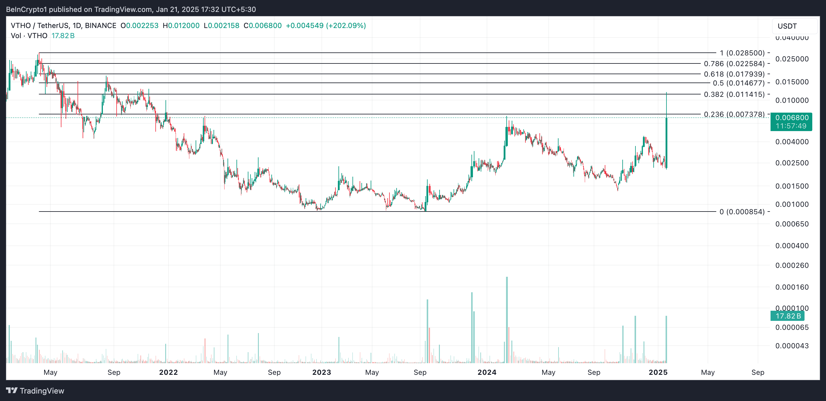 अगर यह रैली जारी रहती है, तो VTHO की प्राइस $0.011 तक पहुंच सकती है। दूसरी ओर, खरीदारी के दबाव में गिरावट प्राइस को $0.0008 की ओर गिरावट की ओर ले जा सकती है।