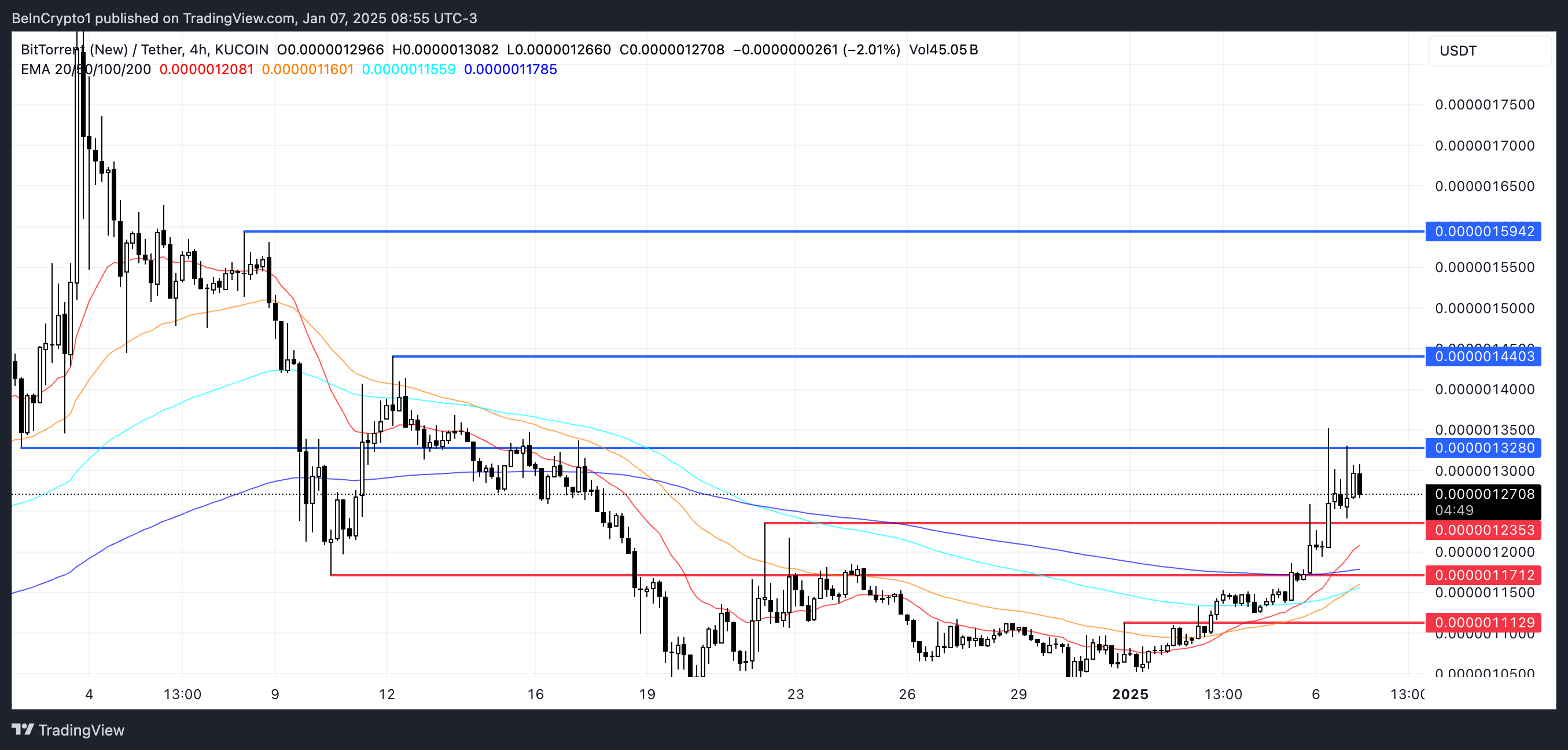 यदि अपट्रेंड जारी रहता है, तो BTT $0.00000132 पर रेजिस्टेंस का परीक्षण कर सकता है। इस स्तर के ऊपर एक ब्रेकआउट प्राइस को $0.00000144 और संभावित रूप से $0.00000159 की ओर धकेल सकता है। बढ़ती ट्रेडिंग वॉल्यूम बढ़ती रुचि का सुझाव देती है, जो अगर मोमेंटम बना रहता है तो आगे की अपवर्ड मूवमेंट का समर्थन कर सकती है।