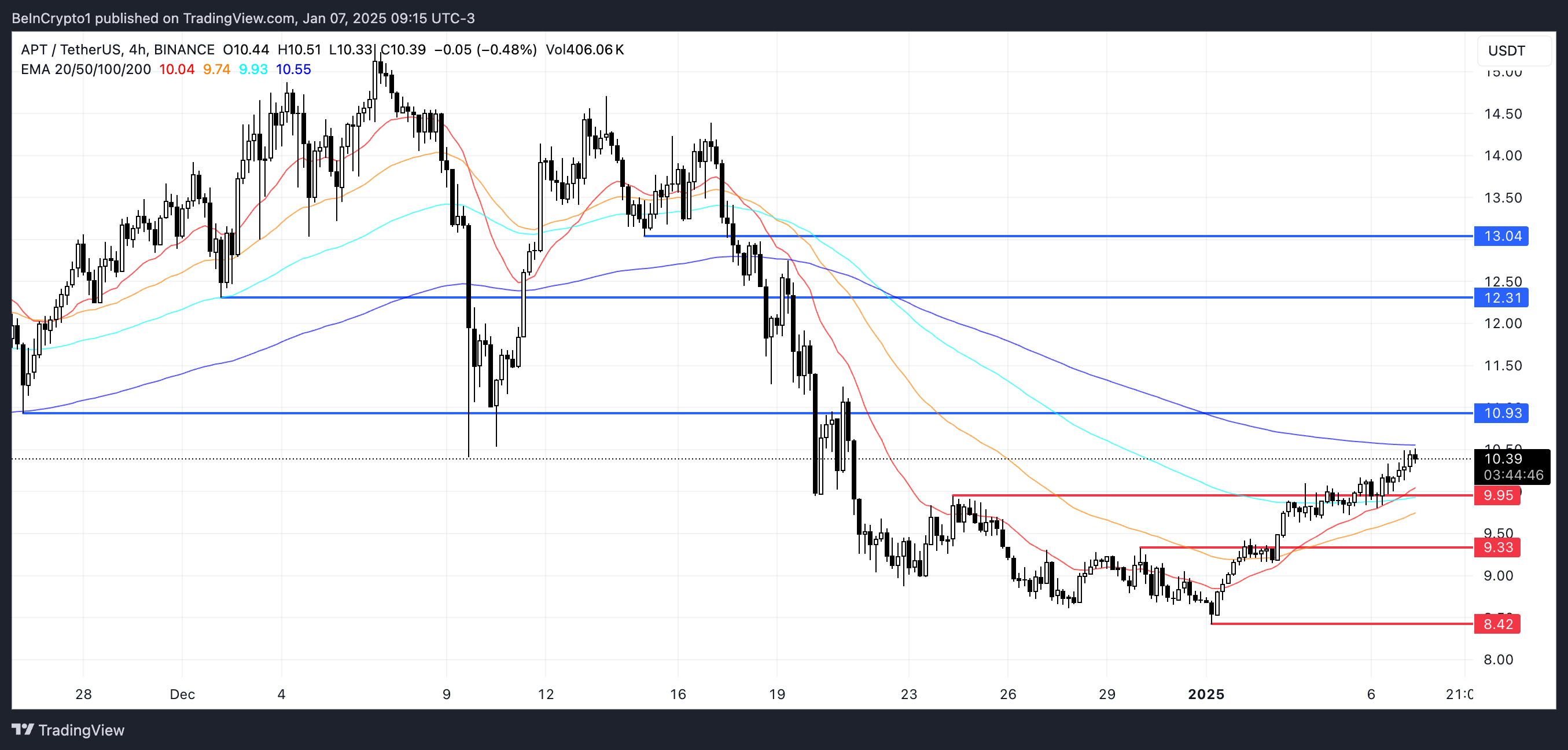 APT की सबसे शॉर्ट-टर्म EMA लाइन तेजी से बढ़ रही है, जो गोल्डन क्रॉस फॉर्मेशन की संभावना का संकेत देती है। अगर यह बुलिश इंडिकेटर बनता है, तो APT प्राइस $10.93 के रेजिस्टेंस को टेस्ट कर सकता है, और एक सफल ब्रेकआउट कीमत को $12.3 और $13 की ओर ले जा सकता है।