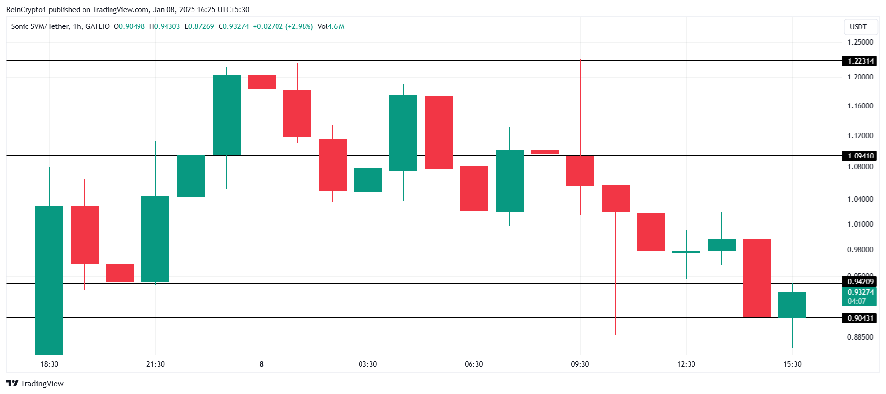 लॉन्च के बाद, SONIC ने अपनी प्रारंभिक लिस्टिंग से एक उल्लेखनीय प्राइस वृद्धि का अनुभव किया, वर्तमान में $0.93 पर ट्रेड कर रहा है। टोकन $1.00 स्तर को सपोर्ट के रूप में सुरक्षित करने का प्रयास कर रहा है। हालांकि, bearish मार्केट कंडीशंस इसकी इस महत्वपूर्ण स्तर को बनाए रखने की क्षमता को चुनौती दे सकती हैं, जो इसके शॉर्ट-टर्म आउटलुक को प्रभावित कर सकती हैं।