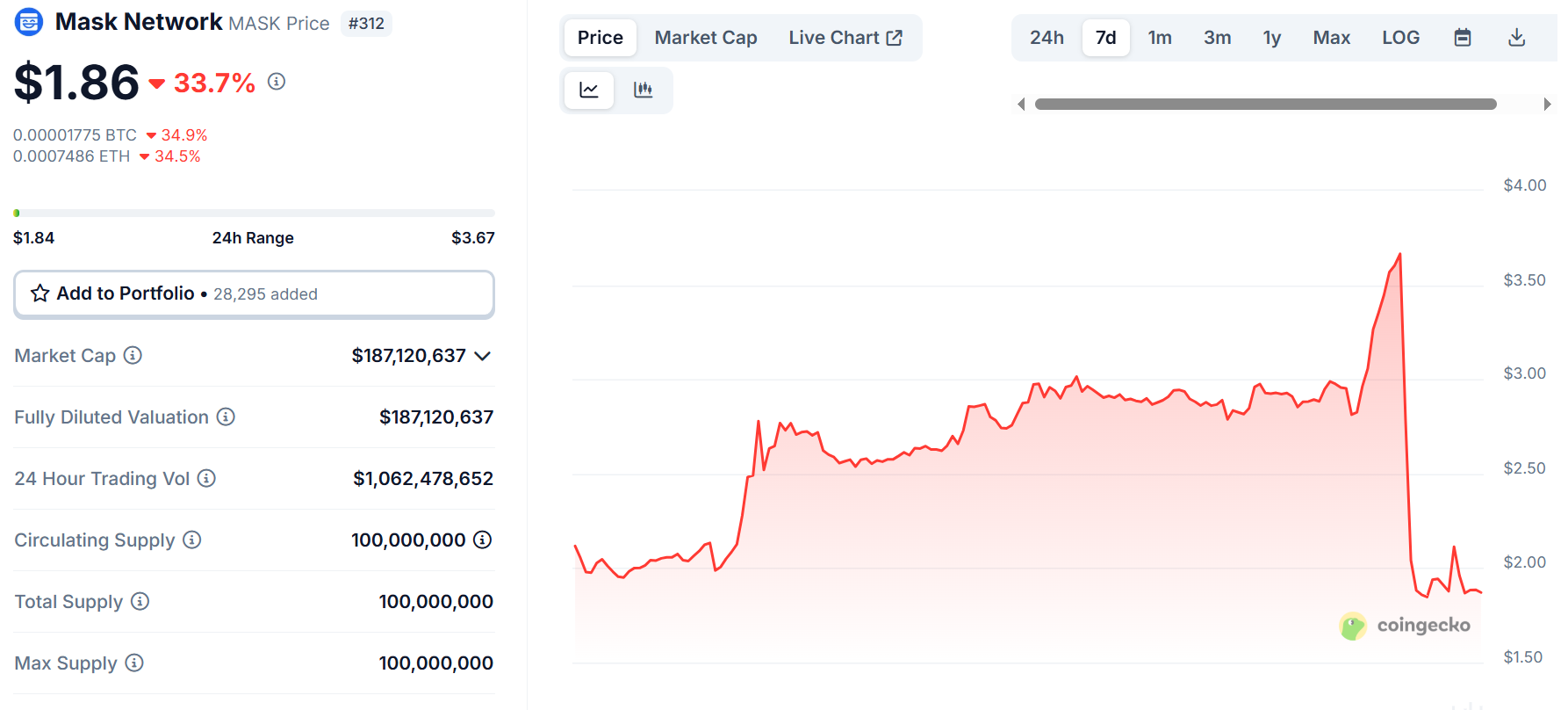 विश्लेषकों के अनुसार, क्रिप्टो मार्केट्स कमजोर रिटेल इंटरेस्ट से जूझ रहे हैं। इस लेखन के समय, MASK टोकन $1.86 पर ट्रेड कर रहा था, CoinGecko दिखा रहा है कि पिछले 24 घंटों में 33.7% की गिरावट आई है।