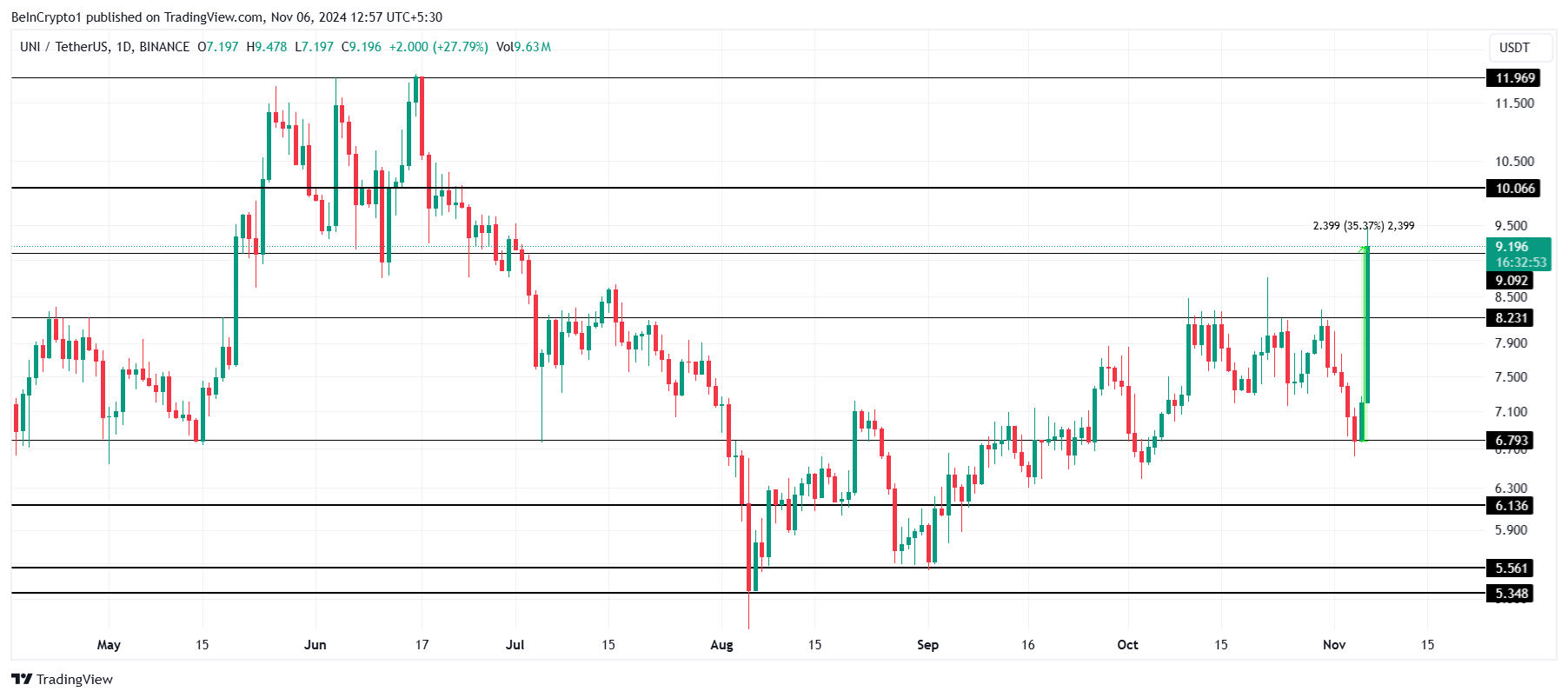 वर्तमान में $9.19 पर ट्रेडिंग कर रहा है, Uniswap की 35% की वृद्धि पिछले 24 घंटों में इसे $9.09 का सपोर्ट लेवल फिर से हासिल करने में सक्षम बनाती है। इस सपोर्ट को बनाए रखना Uniswap के लिए अपनी वर्तमान गति को बनाए रखने के लिए महत्वपूर्ण है, क्योंकि यह अल्टकॉइन को short term में और मूल्य वृद्धि की कोशिश करने की अनुमति देता है।