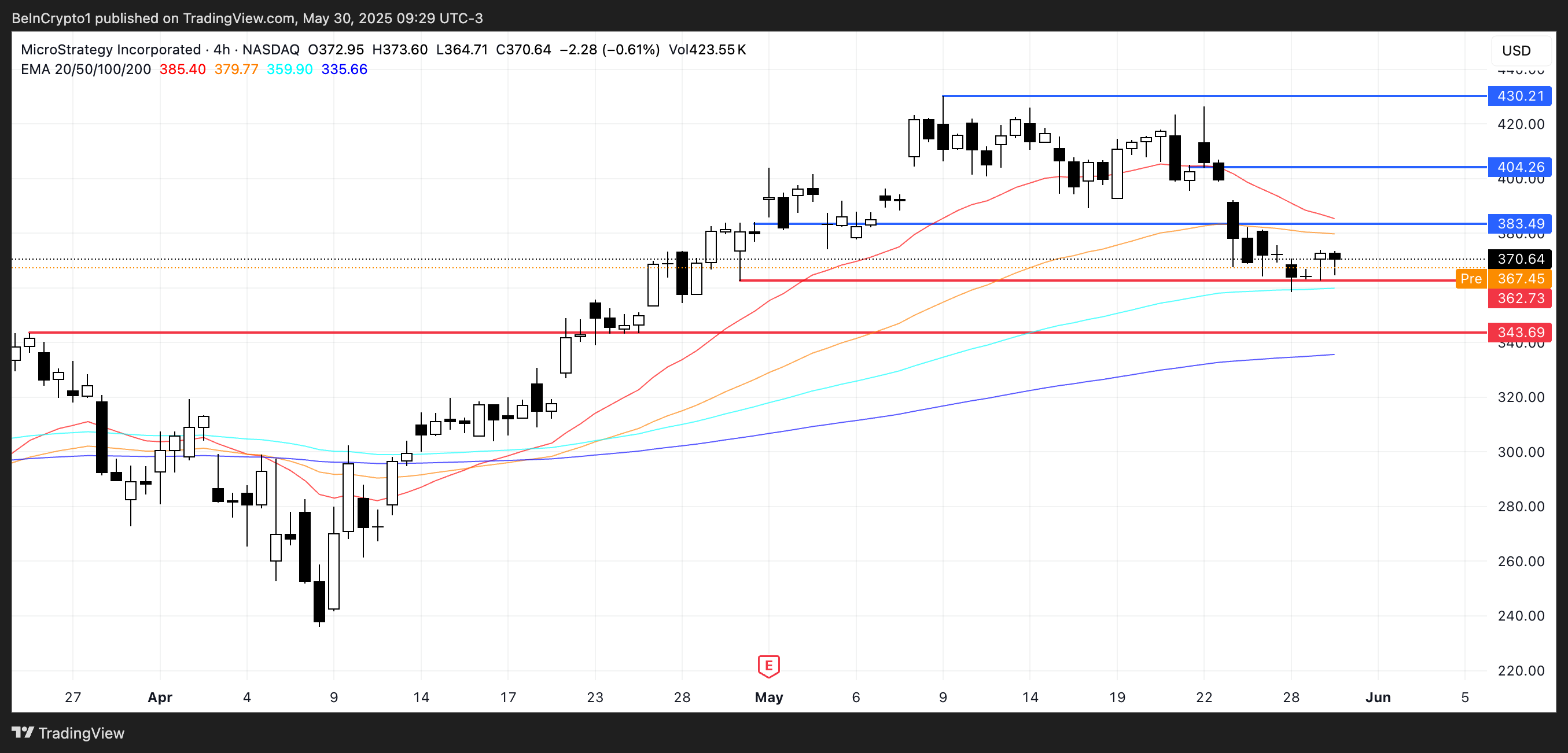 तकनीकी रूप से, MSTR ने $362 के प्रमुख समर्थन से ऊपर मजबूती बनाए रखी है और अब $383 पर प्रतिरोध की ओर देख रहा है। यदि वर्तमान मोमेंटम बना रहता है, तो एक ब्रेकआउट शॉर्ट-टर्म में एक मजबूत रैली को ट्रिगर कर सकता है।