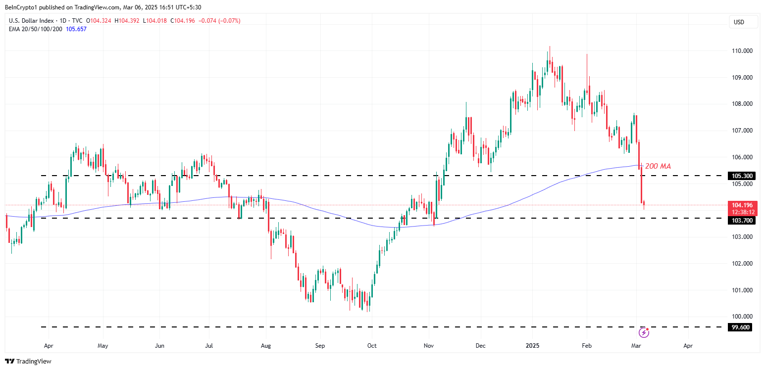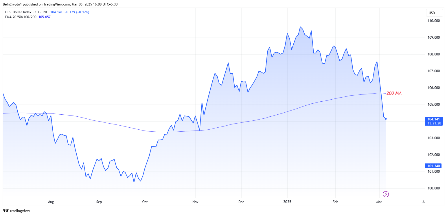 US $ इंडेक्स (DXY) पहली बार नवंबर के बाद अपने 200-दिन के मूविंग एवरेज (MA) से नीचे गिर गया है, जो करेंसी के प्राइस trajectory में एक महत्वपूर्ण बदलाव को दर्शाता है।