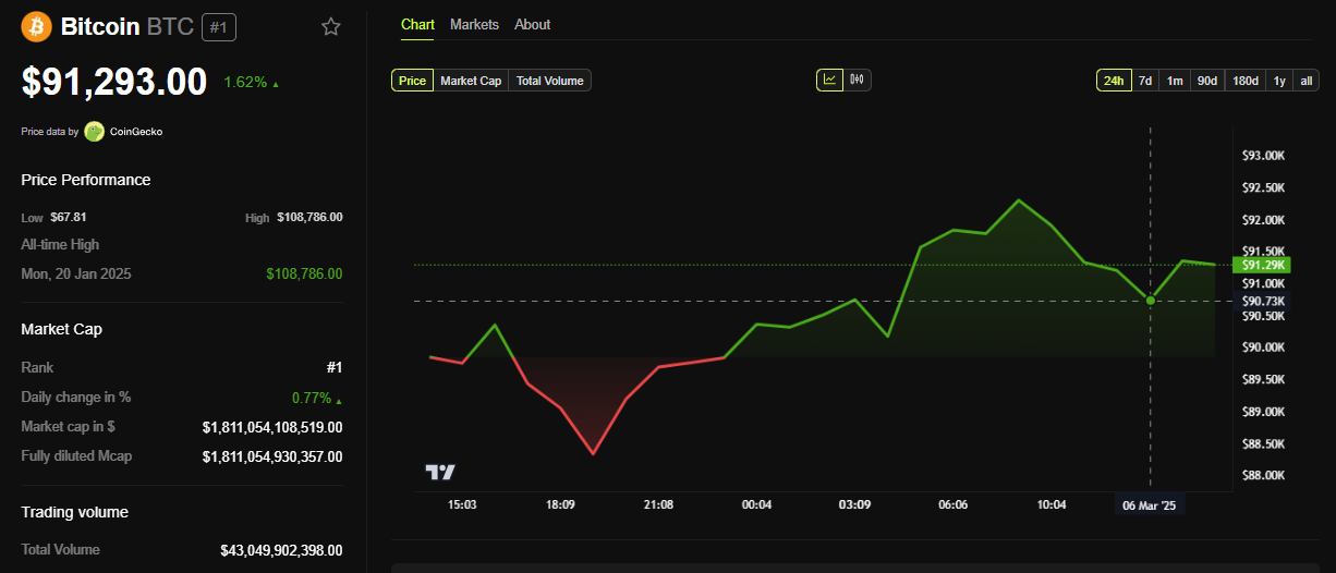BeInCrypto डेटा दिखाता है कि इस लेखन के समय BTC $91,293 पर ट्रेड कर रहा था, गुरुवार के सत्र के खुलने के बाद से 1.62% की मामूली वृद्धि के साथ।