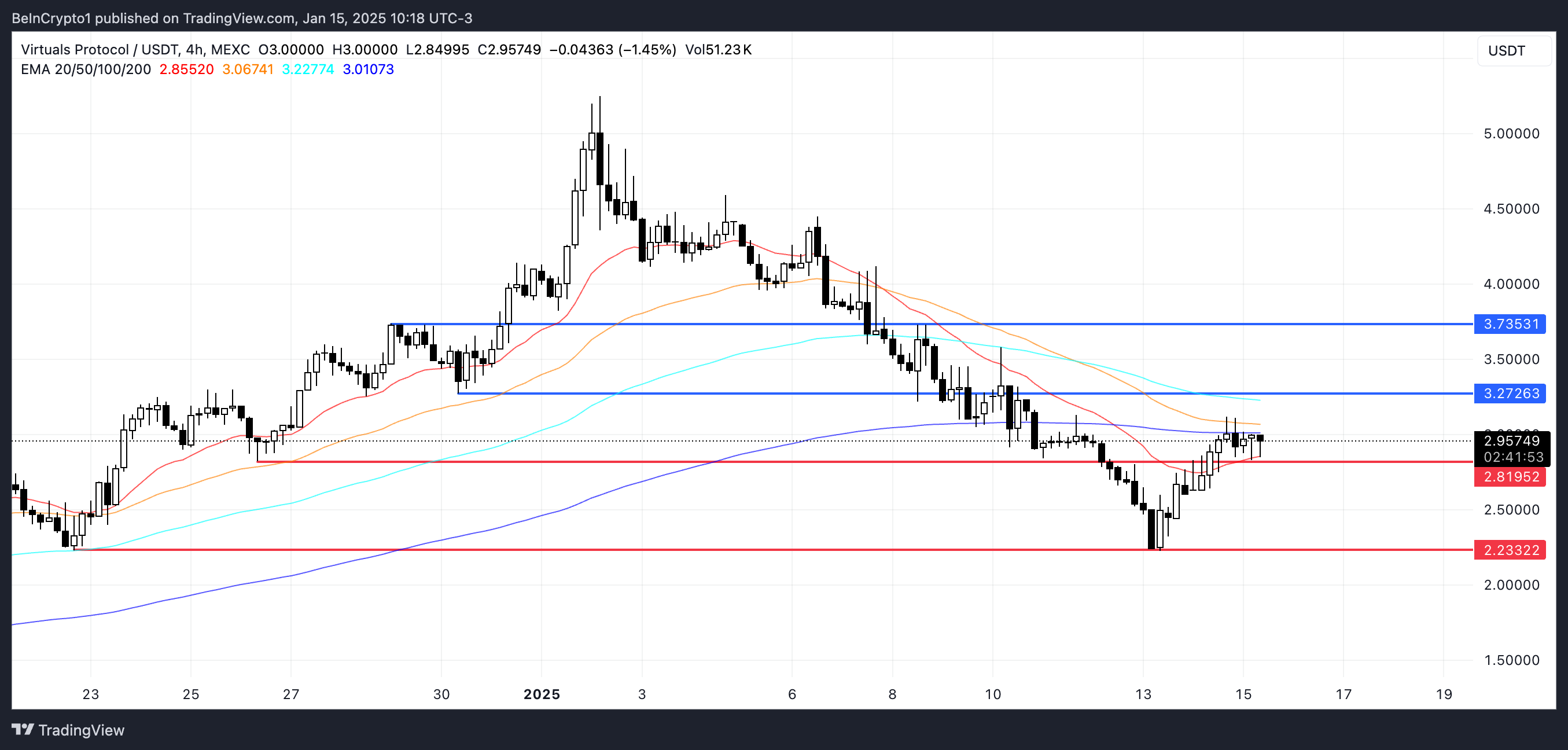 VIRTUAL की कीमत का एक महत्वपूर्ण समर्थन $2.81 पर है, जिसे अगर तोड़ा गया, तो यह $2.23 तक और गिर सकता है। जबकि VIRTUAL EMA लाइन्स अभी भी एक bearish सेटअप दिखाती हैं, जिसमें शॉर्ट-टर्म लाइन्स लॉन्ग-टर्म लाइन्स के नीचे हैं, शॉर्ट-टर्म लाइन्स की अपवर्ड मूवमेंट संभावित बदलाव का सुझाव देती है।