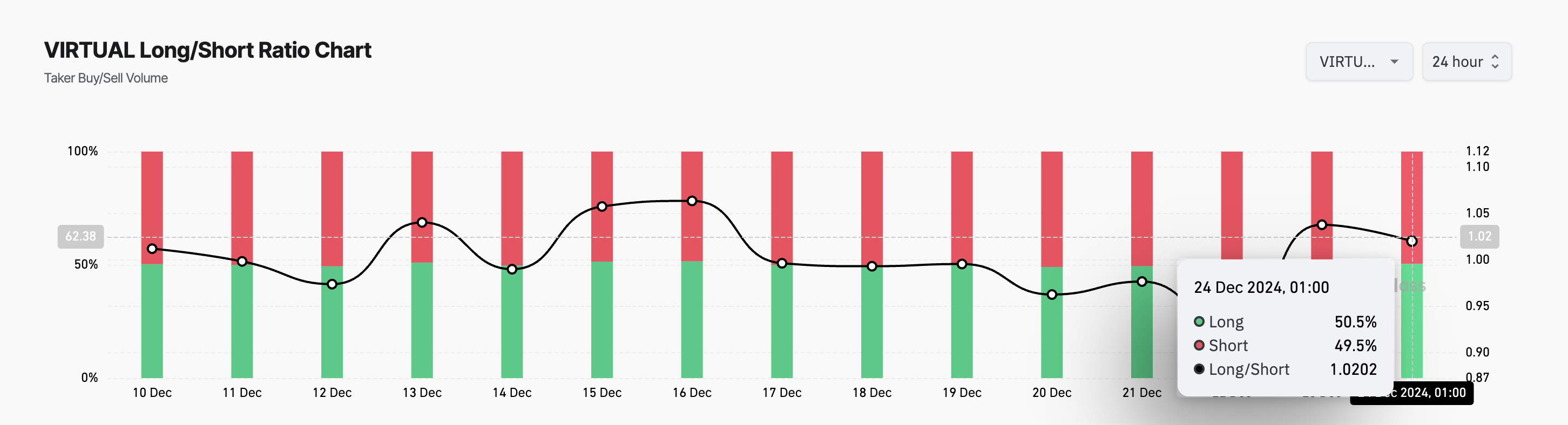इसके अलावा, VIRTUAL का लॉन्ग/शॉर्ट रेशियो इस बुलिश दृष्टिकोण का समर्थन करता है। Coinglass के अनुसार, प्रेस समय में यह 1.02 है, जो लॉन्ग पोजीशन्स की उच्च मांग को दर्शाता है।
