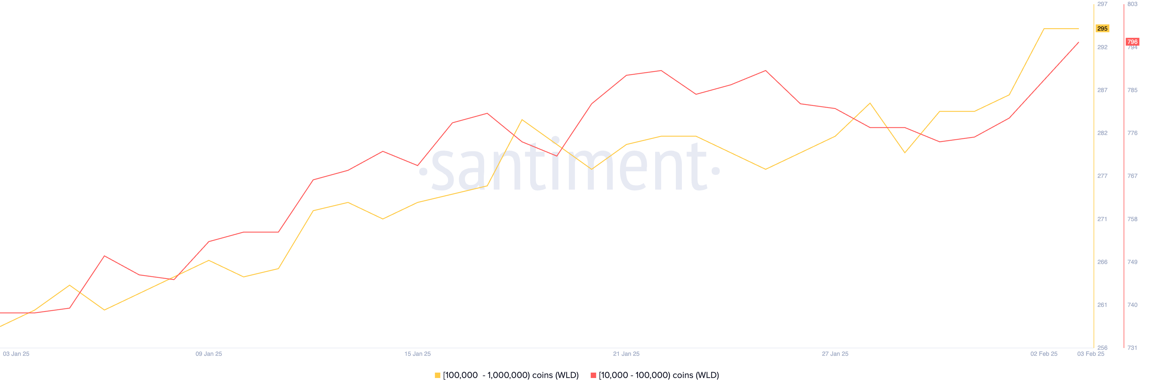 31 जनवरी से, 10,000 से 100,000 WLD रखने वाले व्हेल्स की संख्या, साथ ही 100,000 से 1,000,000 WLD रखने वाले व्हेल्स की संख्या, नए ऑल-टाइम हाई पर पहुंच गई है।