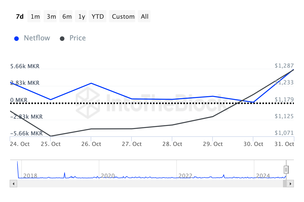 टोकन की वर्तमान कीमत पर, इसका संकेत है कि क्रिप्टो व्हेल्स ने MKR के $7 मिलियन से अधिक मूल्य के खरीदे हैं। यदि इस महीने संचय जारी रहता है, तो अल्टकॉइन की कीमत अल्पावधि में $1,284 से अधिक हो सकती है।