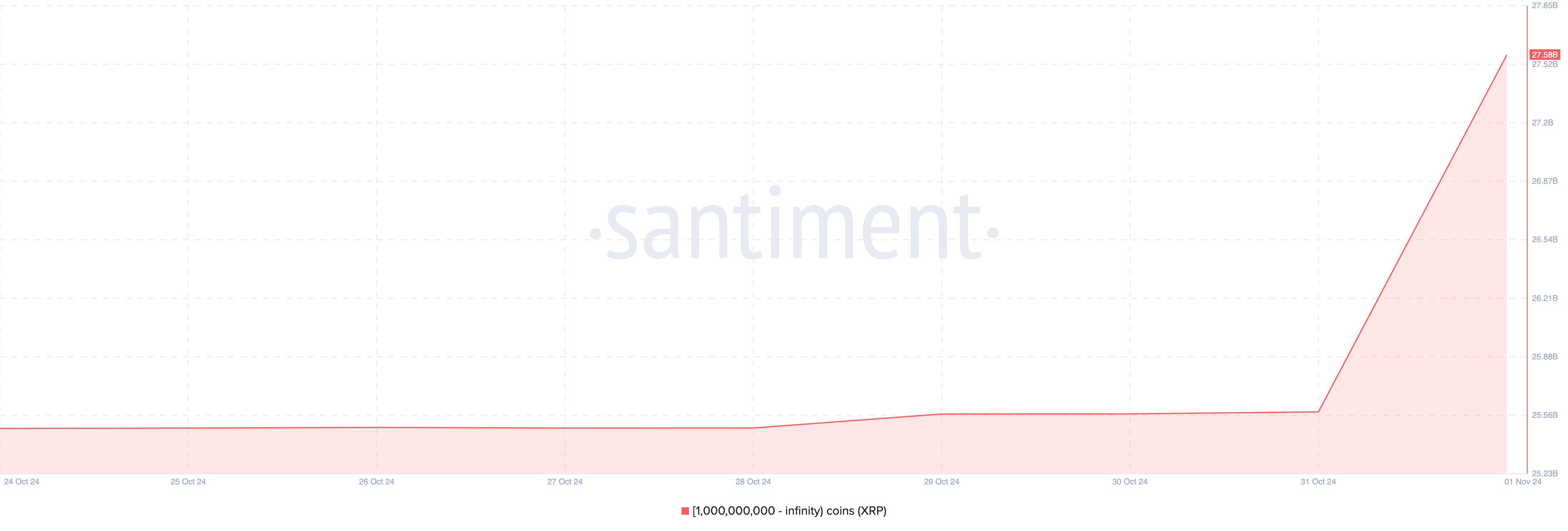 लेकिन 31 अक्टूबर और इस लेखन के समय के बीच चीजें बदल गईं। Santiment के अनुसार, क्रिप्टो व्हेल्स ने लगभग 2 बिलियन XRP खरीदे। वर्तमान कीमत पर, यह संचय $1 बिलियन से अधिक का है।