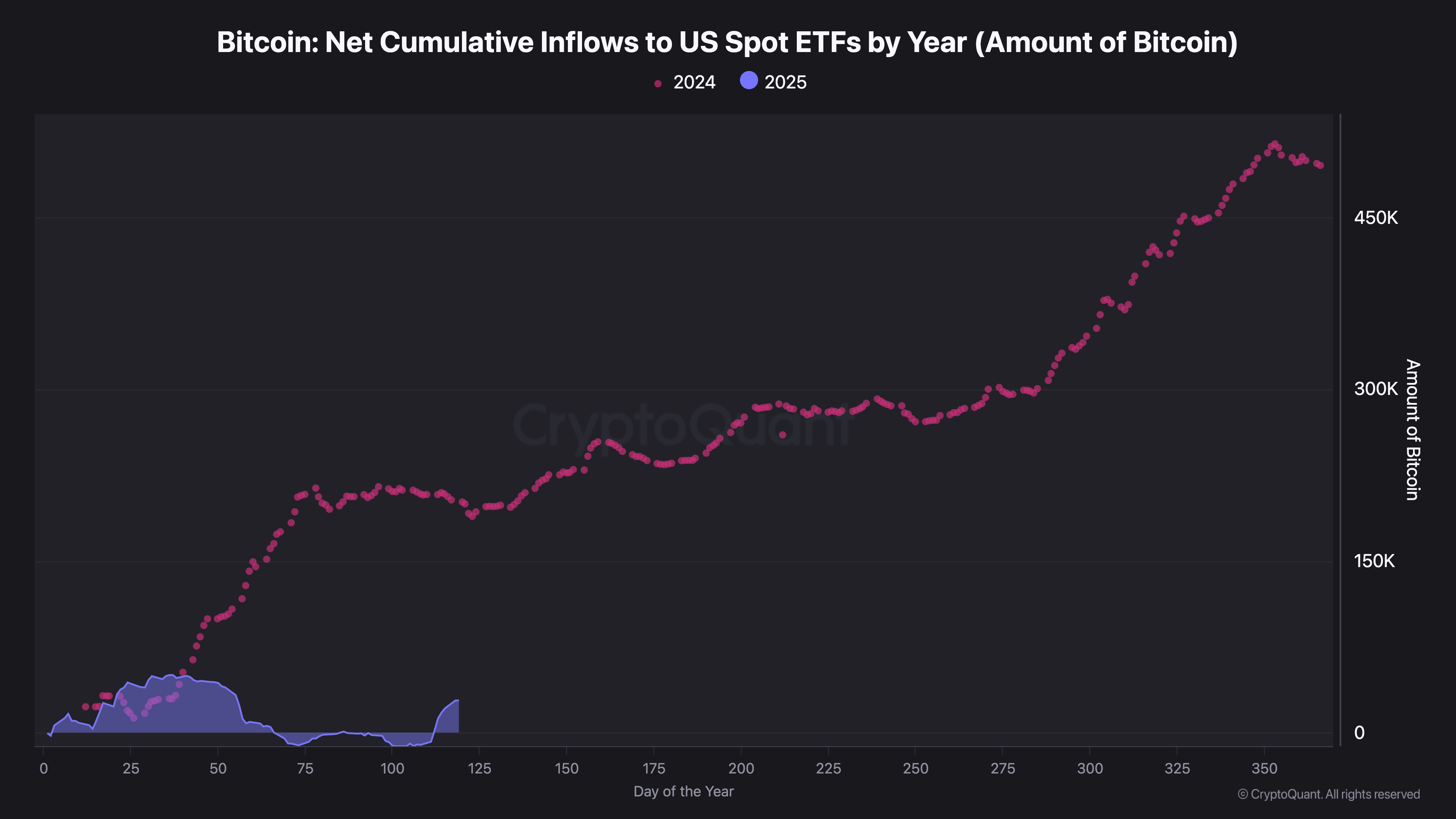 2025 में अब तक, BTC ETFs ने कुल मिलाकर 28,000 BTC का नेट कुल जमा किया है, जो पिछले साल इस समय तक खरीदे गए 200,000 BTC से काफी कम है।