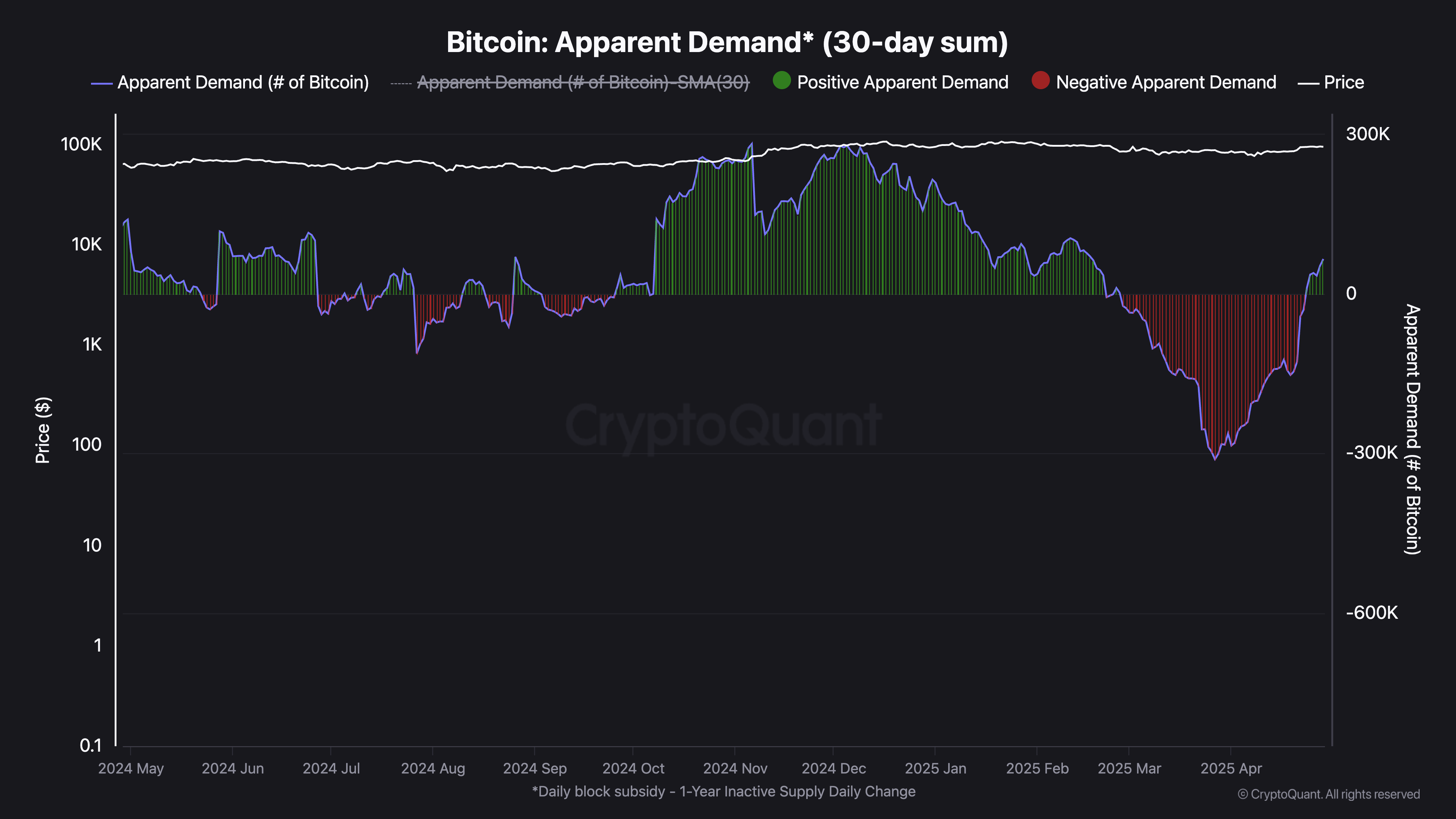 हालांकि वर्तमान मांग स्तर 2024 के पहले के शिखरों से काफी नीचे है, 24 अप्रैल को एक महत्वपूर्ण मोड़ आया: Bitcoin की स्पष्ट मांग सकारात्मक हो गई और लगभग दो महीने की निरंतर ऑउटफ्लो के बाद लगातार छह दिनों तक सकारात्मक बनी रही।