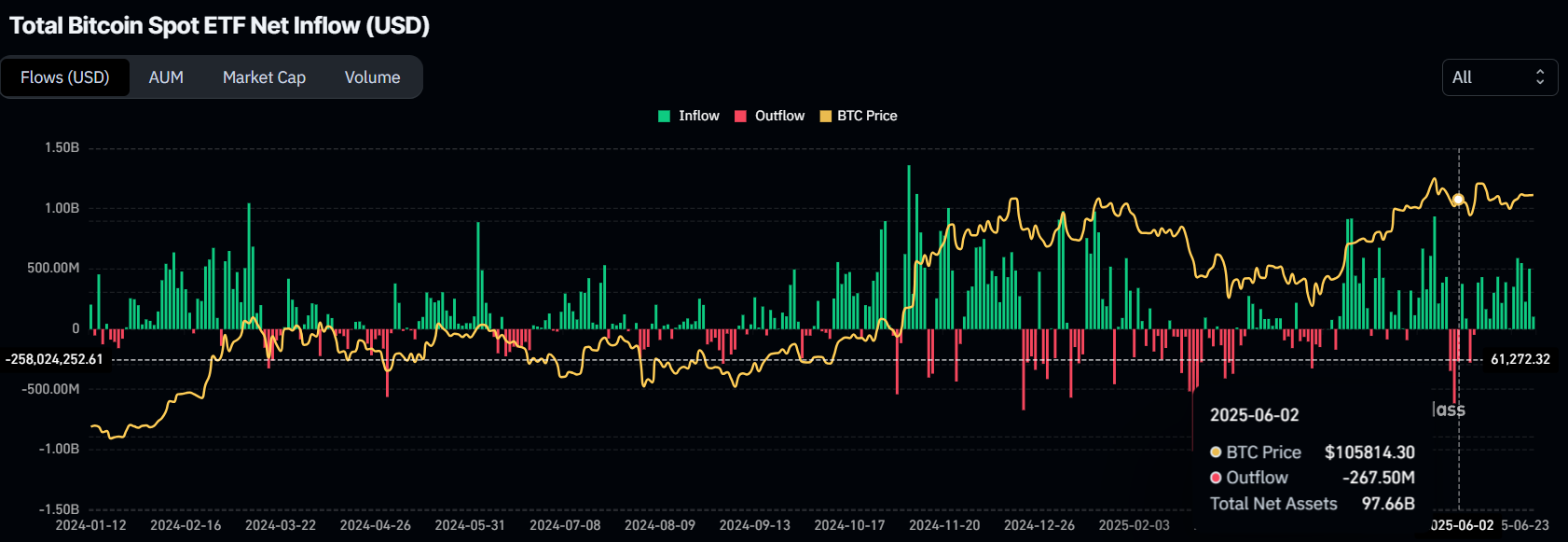 हाल ही में Bitcoin की कीमत पर नीचे की ओर दबाव देखा गया है, जिसमें मैक्रोइकोनॉमिक फैक्टर्स ने प्रमुख क्रिप्टो की समस्याओं में योगदान दिया है। हालांकि, Bitcoin की कीमत स्थिर बनी हुई है, आंशिक रूप से एक्सचेंज-ट्रेडेड फंड्स (ETFs) की स्थिर वृद्धि के कारण।