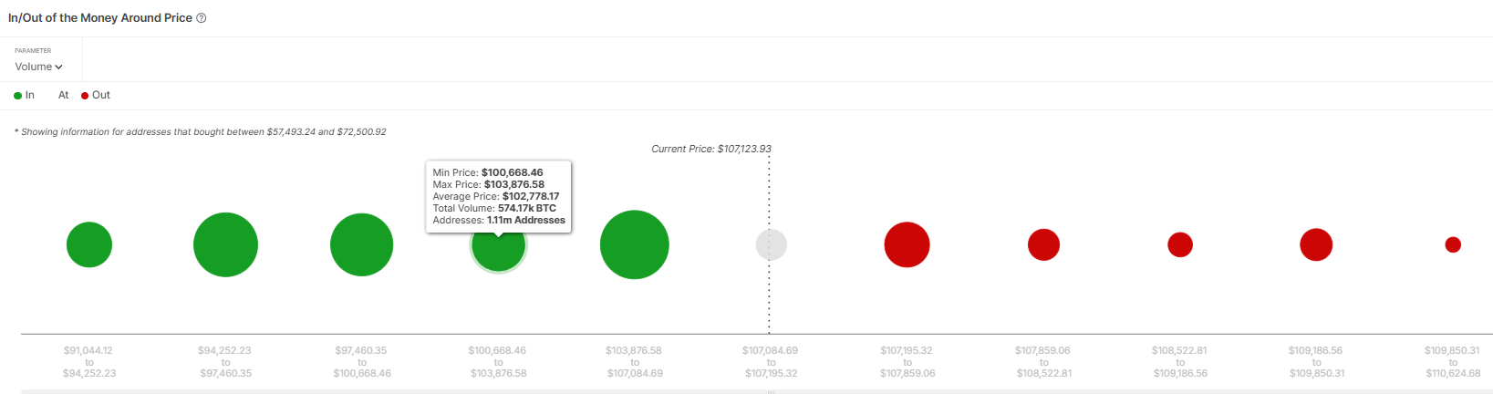 Bitcoin का मैक्रो मोमेंटम इसके सुरक्षित आश्रय क्षेत्र द्वारा समर्थित है, जो $100,000 और $103,000 के बीच स्थित है। IOMAP से हालिया डेटा दिखाता है कि $100,668 और $103,876 के बीच, निवेशकों ने एक महत्वपूर्ण मात्रा में Bitcoin खरीदा, लगभग 574,170 BTC जिसकी कीमत $61.41 बिलियन से अधिक है।