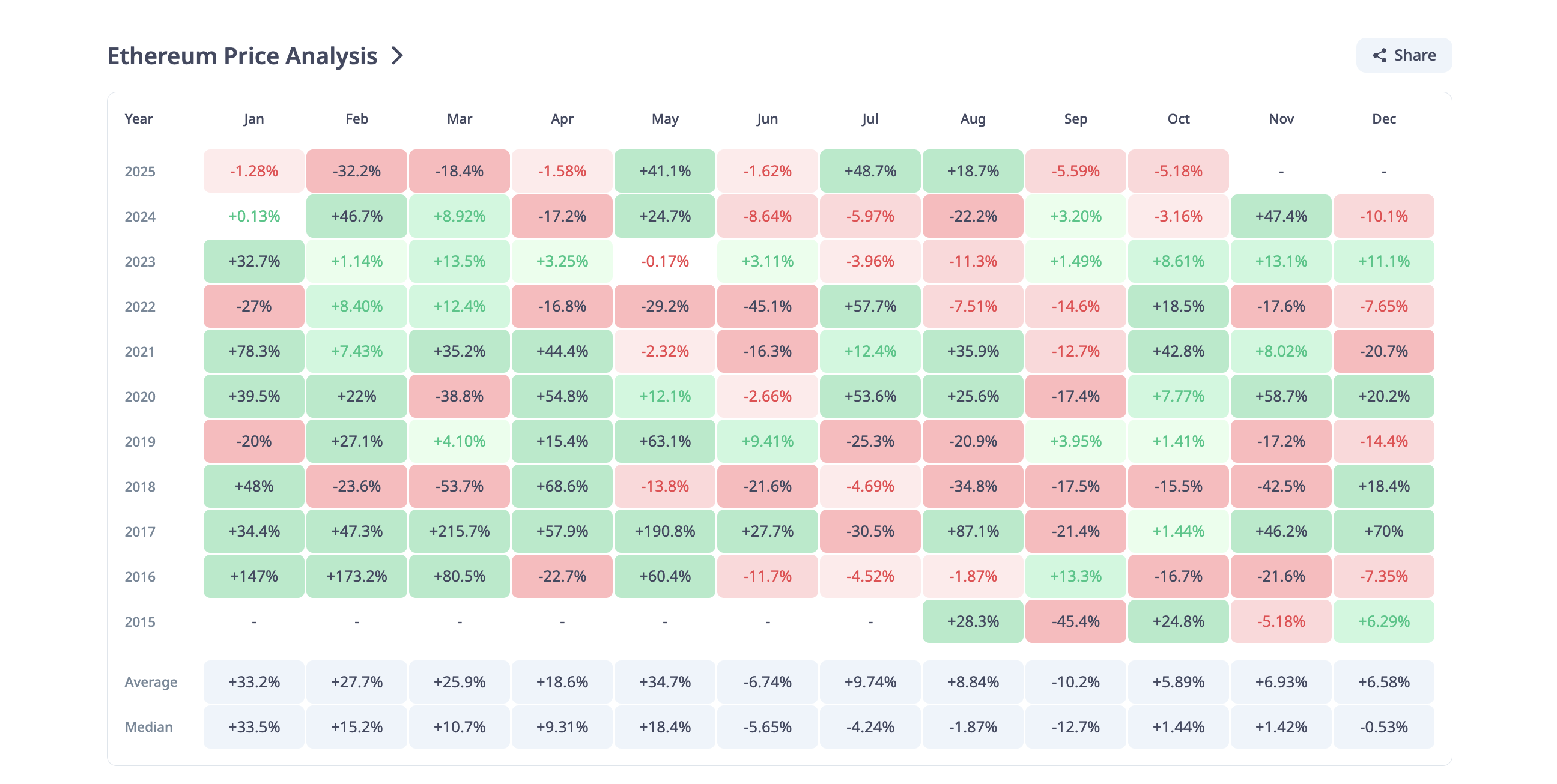 Ethereum का November रिकॉर्ड बुलिश है। पिछले आठ साल में औसतन 6.9% से ज्यादा गेंस दिए हैं, और 2024 की 47.4% रैली इसके रिकॉर्ड पर बेस्ट महीनों में से एक रही है।