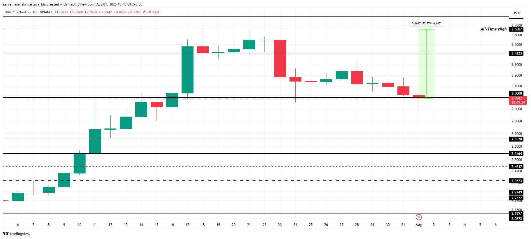 XRP ने जुलाई में एक नई ऑल-टाइम हाई (ATH) बनाते हुए एक प्रभावशाली रैली की है। हालांकि कीमत उस शिखर से थोड़ी गिर गई है, लेकिन XRP अभी भी अपने $3.66 के ATH के करीब है।