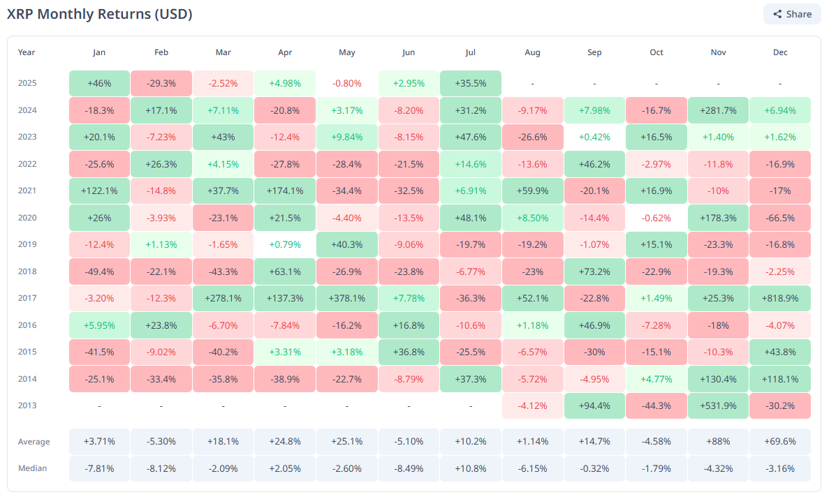 वर्तमान में, XRP $2.99 पर ट्रेड कर रहा है, जो $3.00 के मुख्य समर्थन स्तर से नीचे फिसल गया है। जबकि यह altcoin अभी भी अपने $3.66 के ऑल-टाइम हाई से 22% से अधिक दूर है, संभावित वृद्धि के लिए आधार मजबूत बना हुआ है। ऐतिहासिक डेटा ने दिखाया है कि अगस्त आमतौर पर XRP के लिए बियरिश मोमेंटम लाता है, जिसमें मासिक औसत रिटर्न -6% होता है।