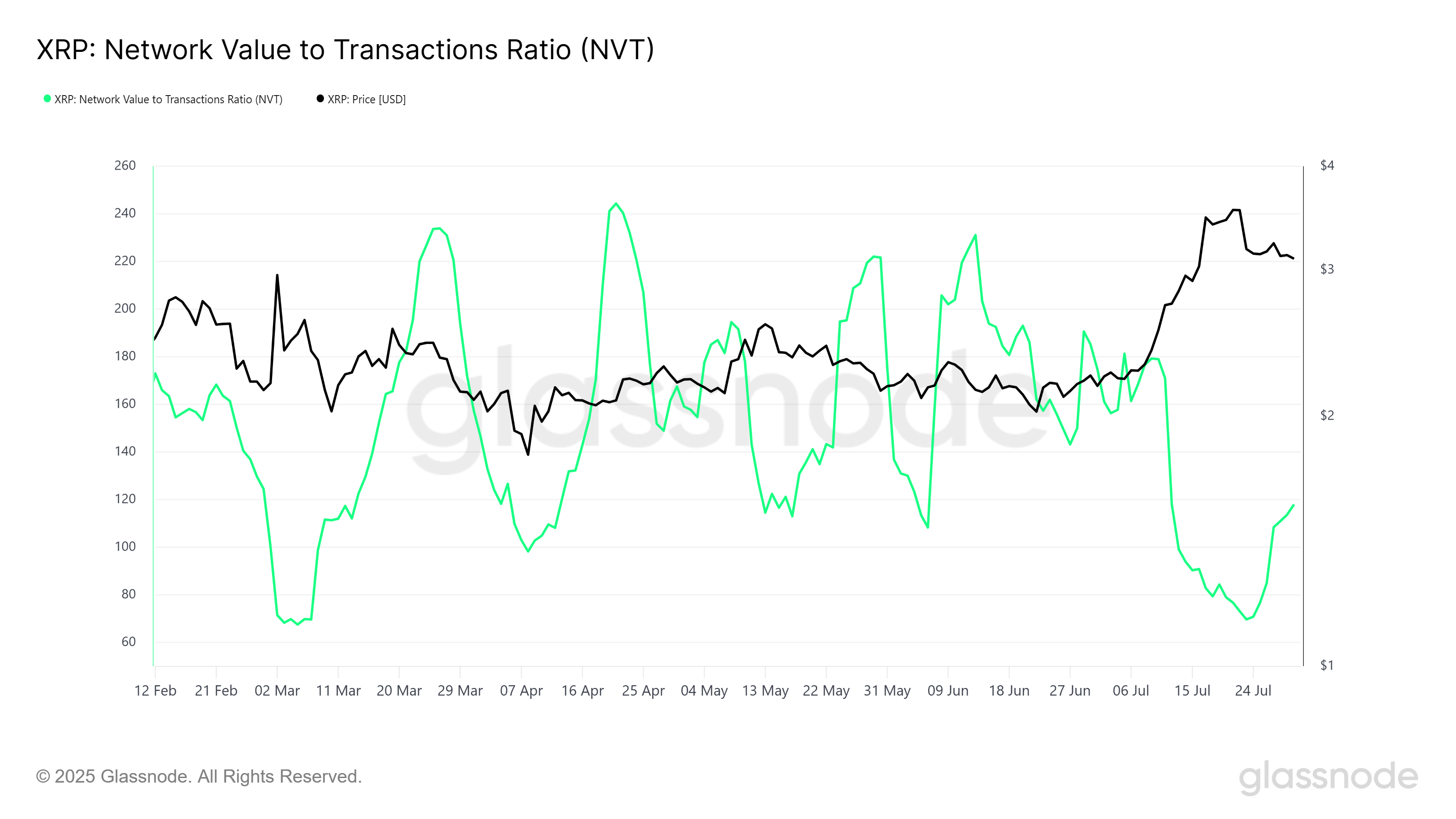 XRP का मैक्रो मोमेंटम पॉजिटिव तकनीकी इंडिकेटर्स द्वारा भी समर्थित है, विशेष रूप से NVT (नेटवर्क वैल्यू टू ट्रांजैक्शन) रेशियो। यह रेशियो वर्तमान में पांच महीने के निचले स्तर पर है, जो संकेत देता है कि नेटवर्क वैल्यू ने अभी तक लेन-देन गतिविधि को पार नहीं किया है। यह XRP के लिए महत्वपूर्ण है, क्योंकि यह इंगित करता है कि क्रिप्टोकरेन्सी अभी तक ओवरहीट नहीं हुई है।
