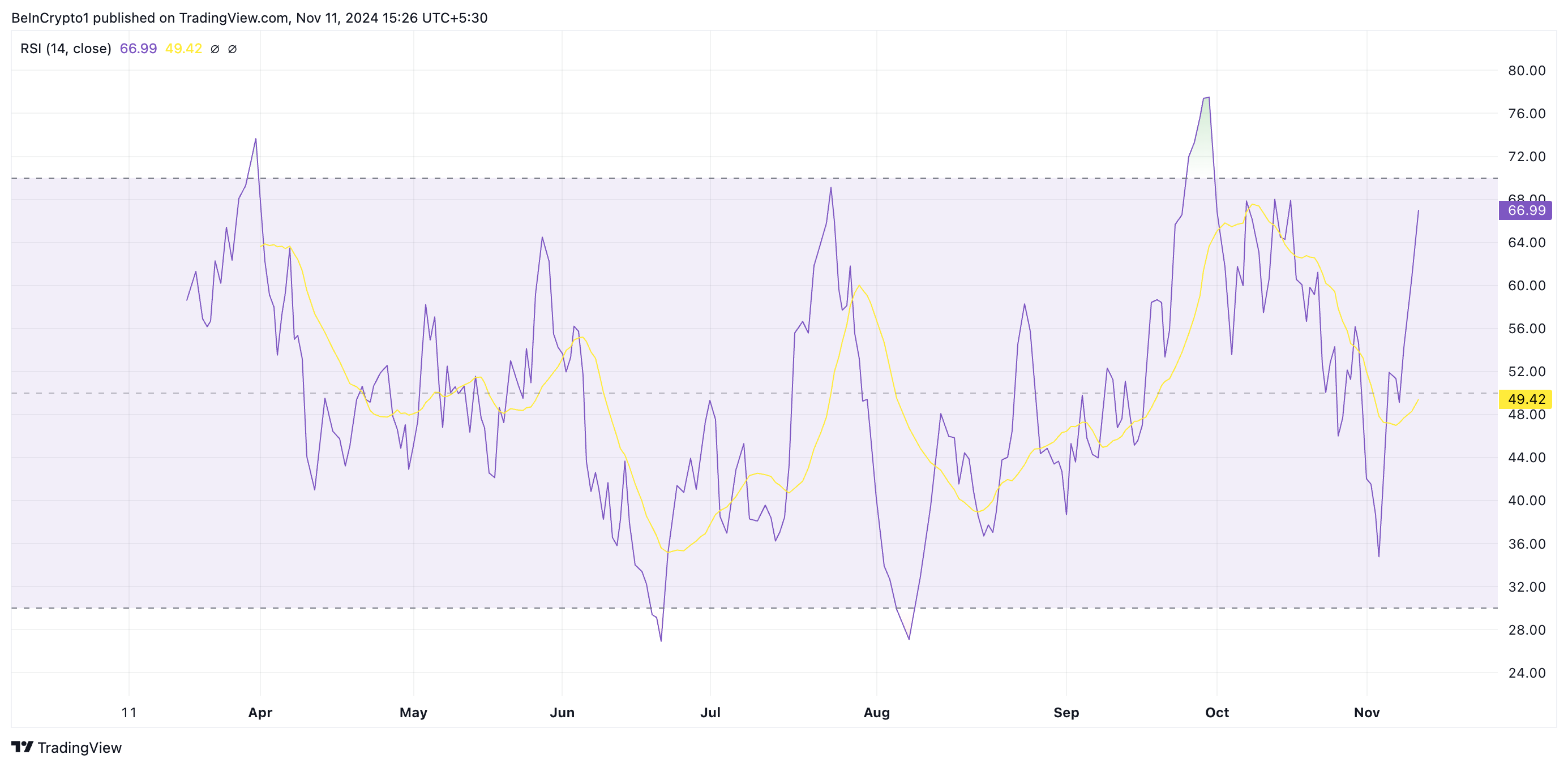 RSI सूचक किसी संपत्ति के ओवरबॉट और ओवरसोल्ड बाजार की स्थितियों को मापता है। यह 0 से 100 के बीच होता है, जिसमें 70 से ऊपर के मूल्य यह सुझाव देते हैं कि संपत्ति ओवरबॉट है और इसे सुधार की आवश्यकता है। इसके विपरीत, 30 से नीचे के मूल्य यह इंगित करते हैं कि संपत्ति ओवरसोल्ड है और इसमें गिरावट आ सकती है।