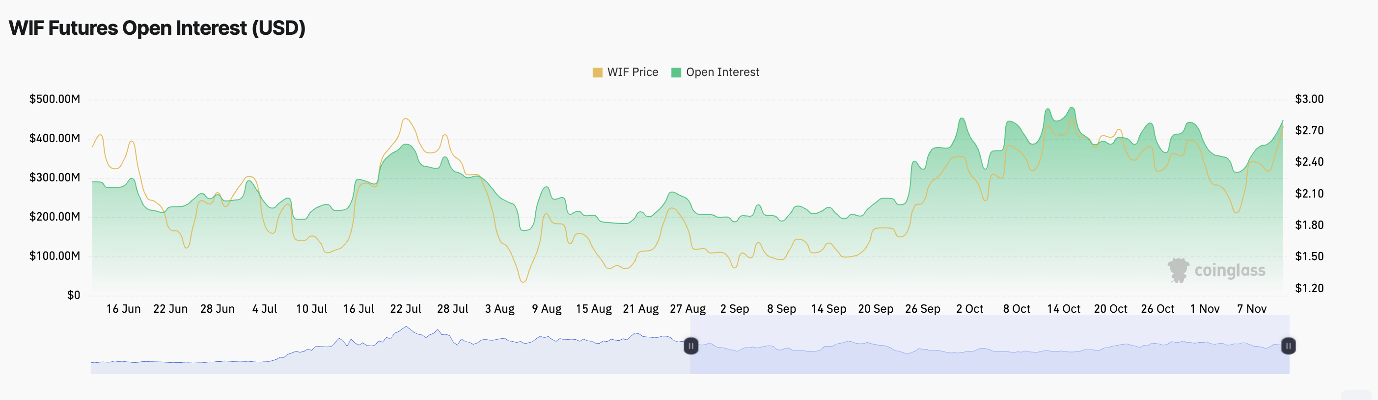 इसके अलावा, WIF की कीमत में वृद्धि इसकी खुली ब्याज में वृद्धि के साथ हो रही है। यह वर्तमान में मासिक उच्चतम $448 मिलियन है।