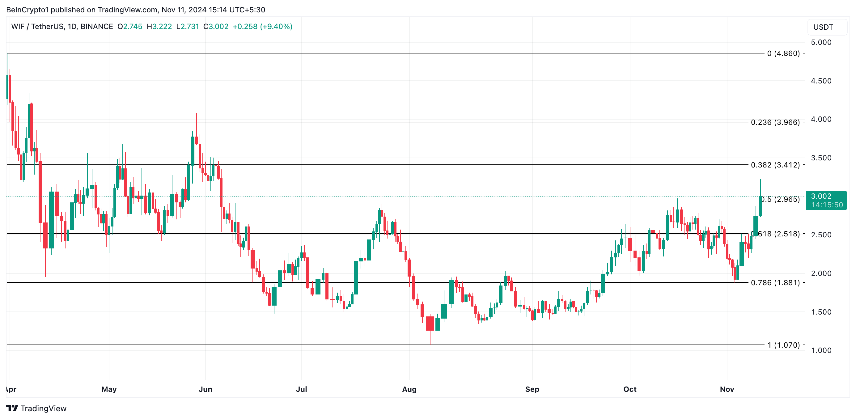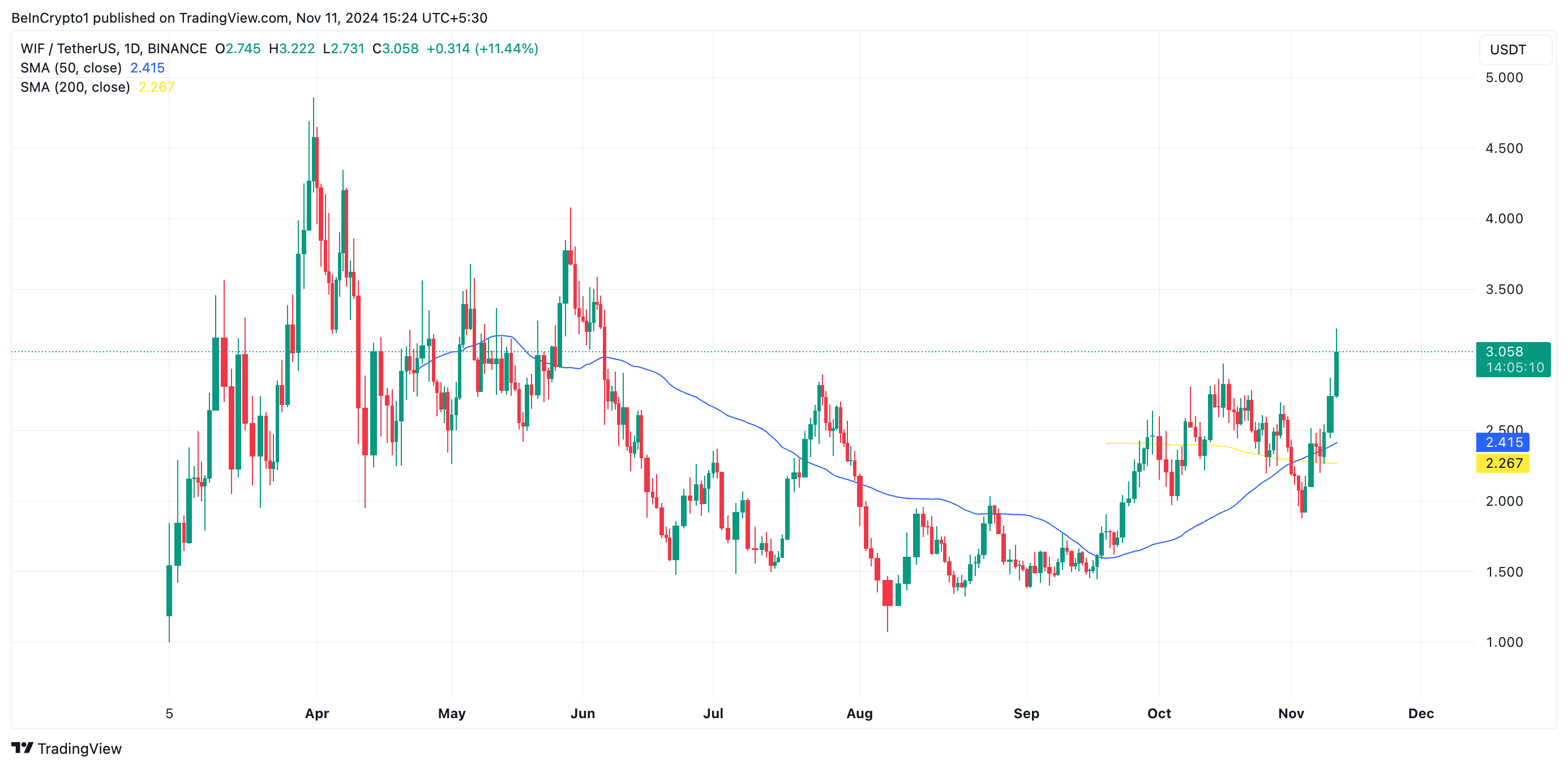Dogwifhat का (WIF) 50-दिन का साधारण मूविंग एवरेज (SMA) 1 नवंबर को इसके 200-दिन के SMA के ऊपर चला गया, जिससे एक गोल्डन क्रॉसओवर बना — एक बुलिश संकेतक जो संभावित ऊपरी गति का संकेत देता है। इस तकनीकी घटना के बाद, WIF की कीमत में 37% की वृद्धि हुई, जिससे यह पाँच महीने के उच्चतम स्तर $3 तक पहुँच गई।