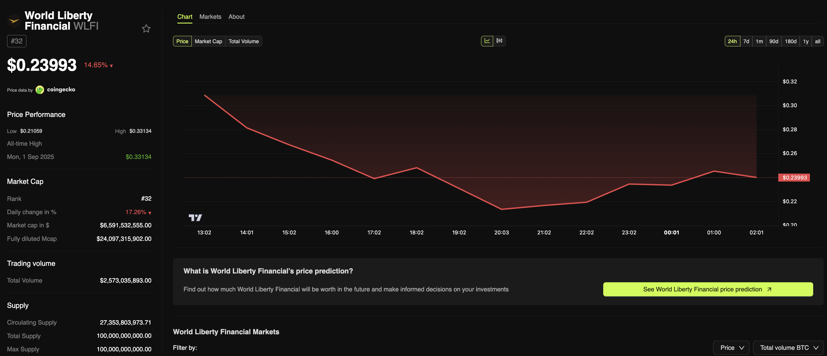 WLFI ने हाल ही में ट्रेडिंग शुरू की है। BeInCrypto मार्केट के डेटा के अनुसार, टोकन की अधिकतम सप्लाई 100 बिलियन पर सीमित है, जिसमें लगभग 24.7 बिलियन WLFI वर्तमान में सर्क्युलेशन में हैं। WLFI $0.24 पर ट्रेड कर रहा है, जो कुछ घंटे पहले के ऑल-टाइम हाई से 26% नीचे है।